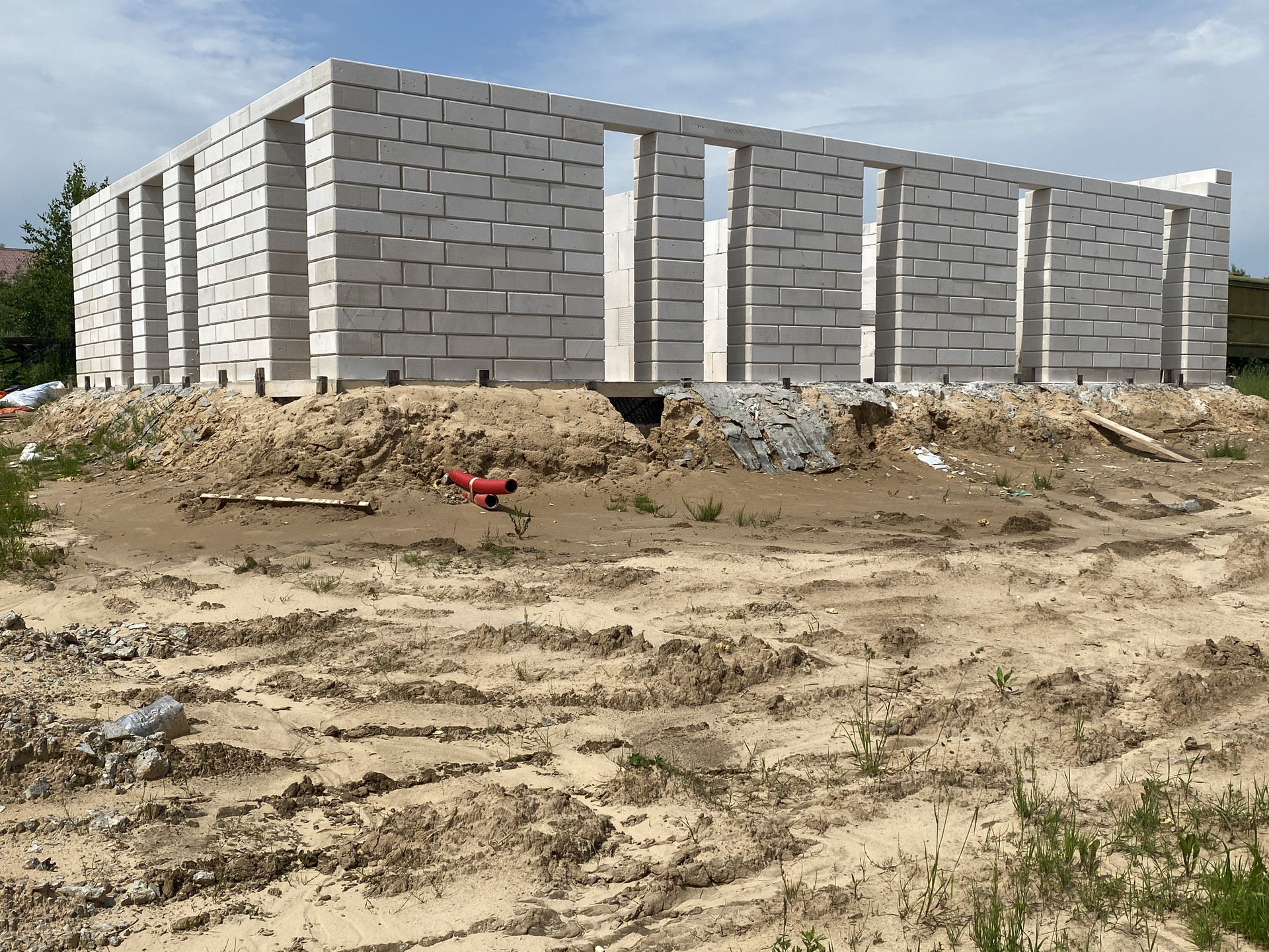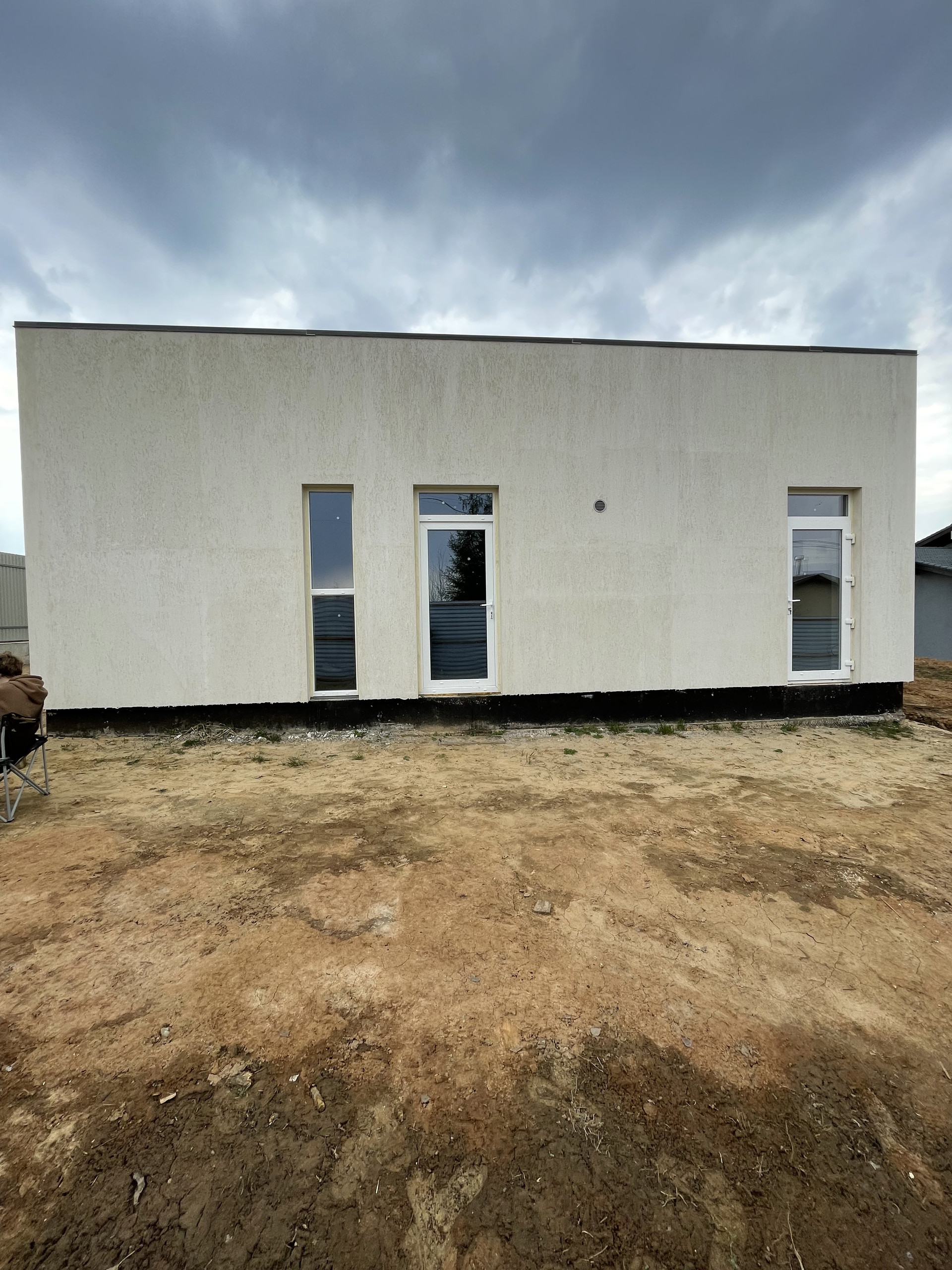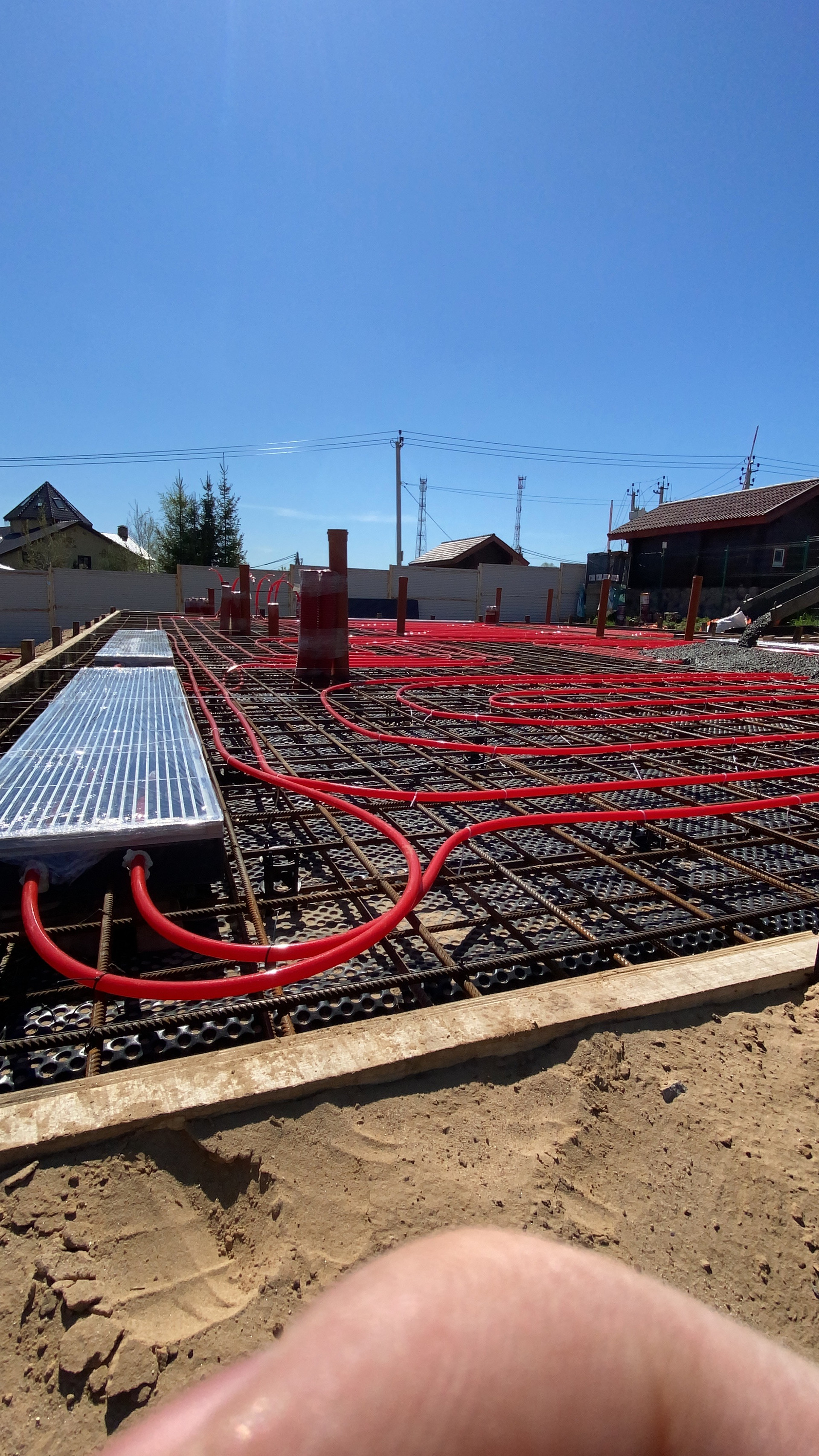 Фундаментные работы сделаны с учетом двух этажей. Инженерные коммуникаций в бетонной плите, электрика и любые другие коммуникацией в полу. Для меня было важно объём воздуха и чтоб не давил потолок, поэтому не пожалел и вывел стены высотой 3.40м.