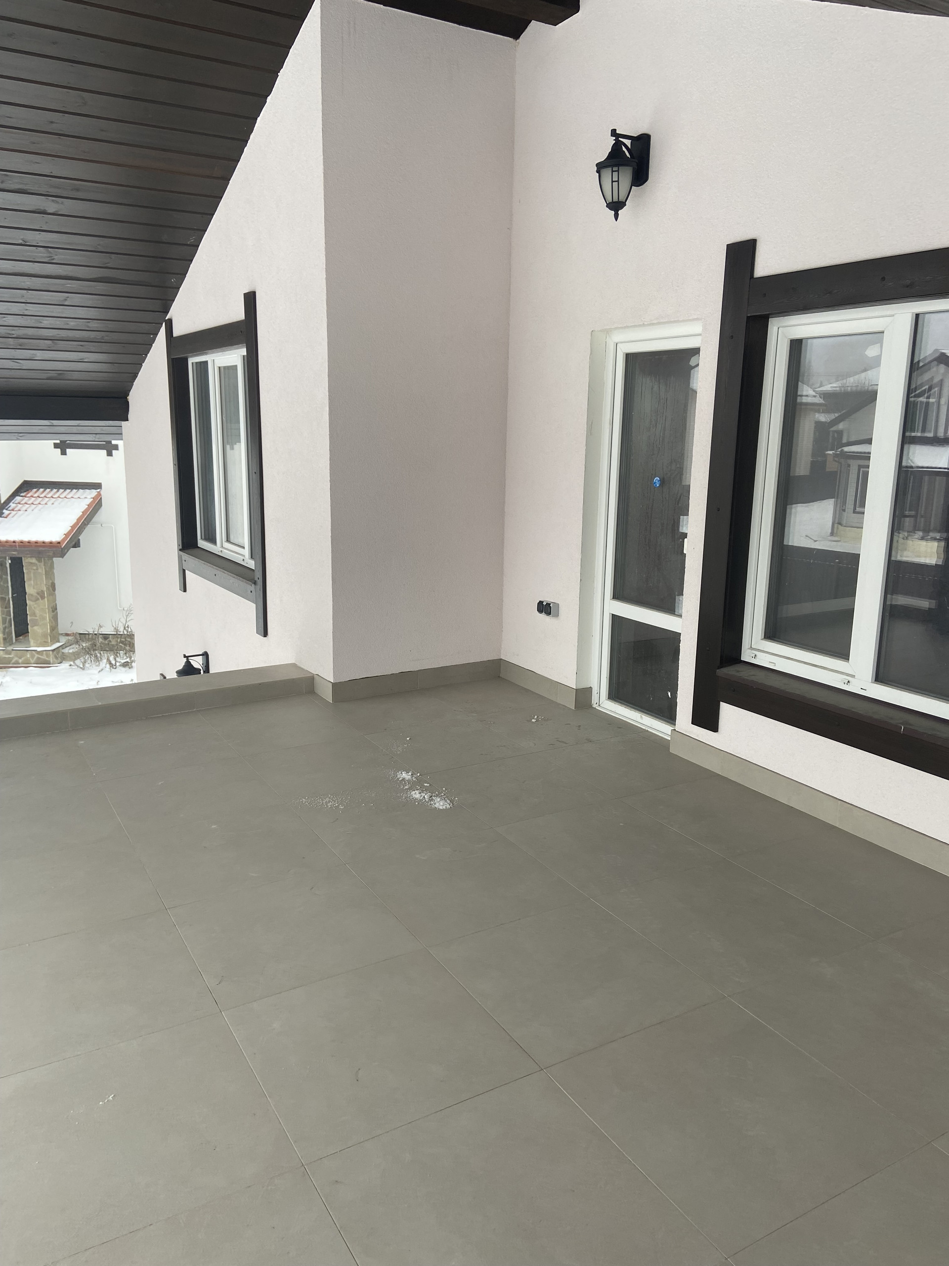 Стены выполнены из пенобетонных блоков, утеплитель, декоративная фасадная штукатурка; толщина стен 450 мм; окна: пластиковые REHAU; крыша: метало черепица. Внешняя отделка дома полностью закончена.