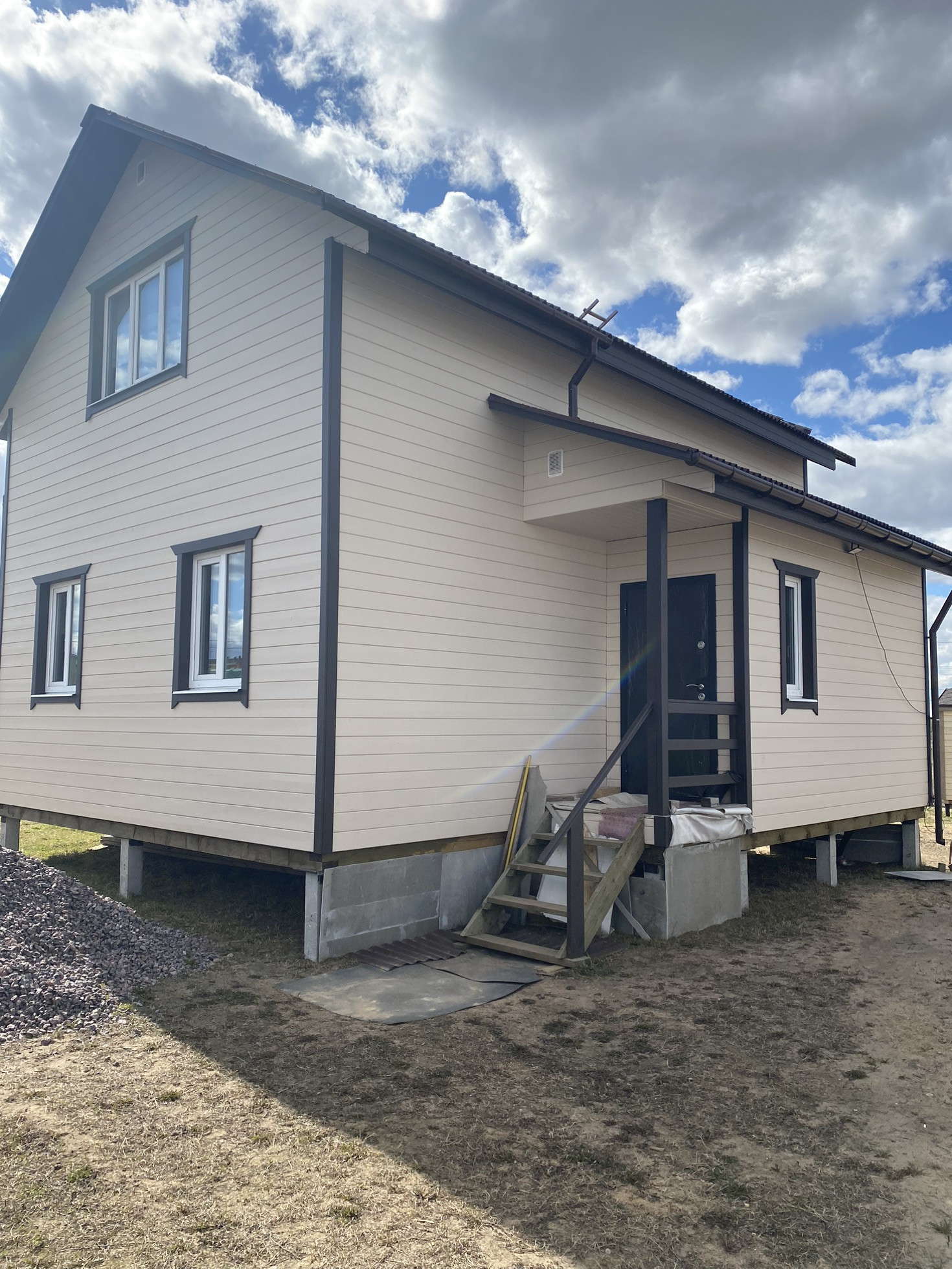 Внутри выполнена разводка  водоснабжения. Установлены окна ПВХ с двухкамерным стеклопакет . Две  комнаты на первом этаже обшиты вагонкой. В санузле на 1 этаже установлены унитаз и раковина.