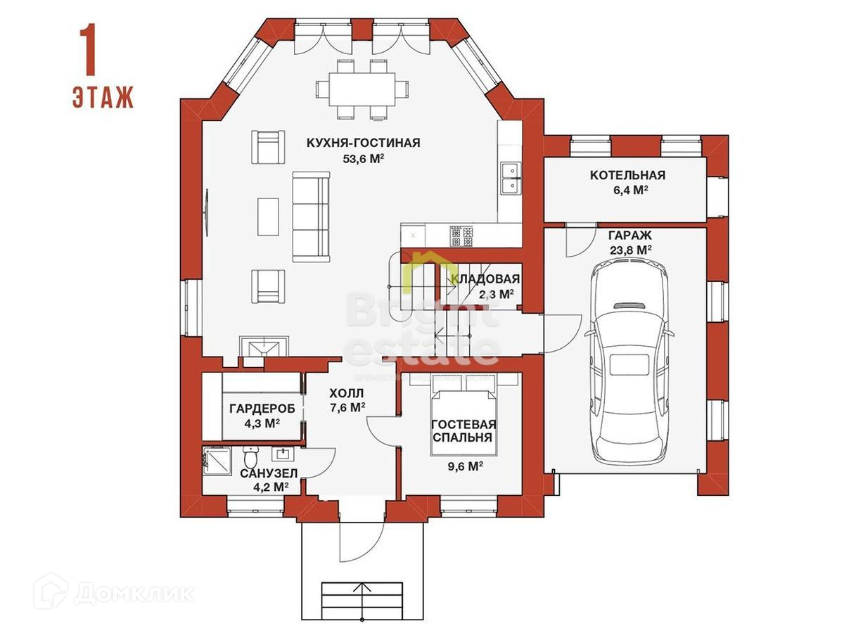 1 этаж: холл, гардеробная, гостевая спальня, с/у, кухня-гостиная, гараж на 1 м/м, котельная, кладовая.