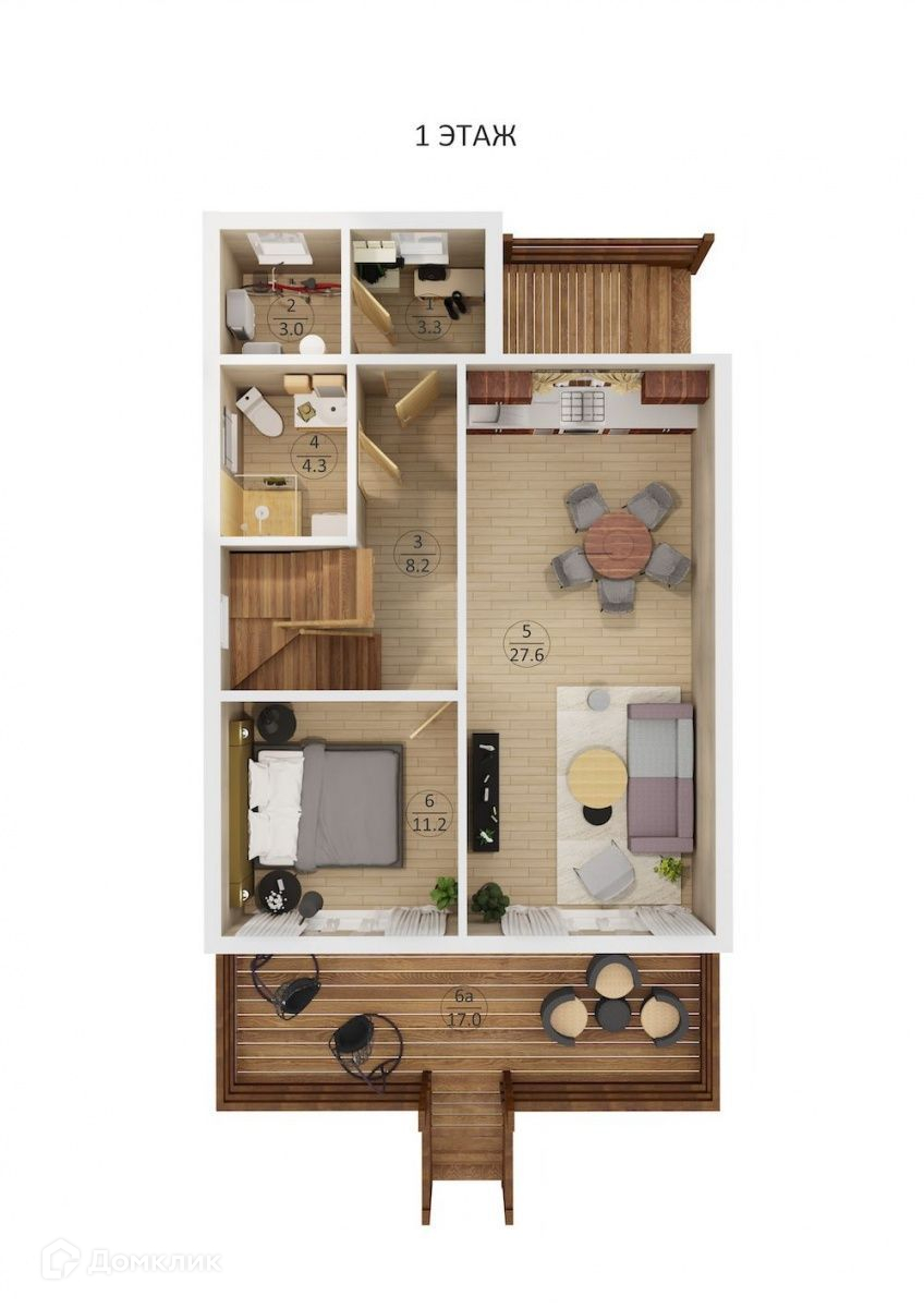 санузел, 1 спальная комната, кухня-гостиная, терраса.