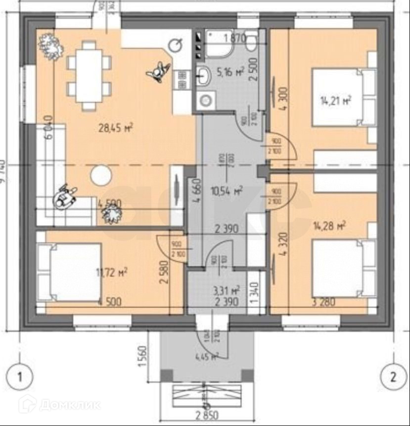 На фото дом 10м*9м, площадь по наружным стенам 90 м кв, внутри 70 кв м с тремя спальнями, кухней гостиной, с шикарным сан узлом и входной группой.