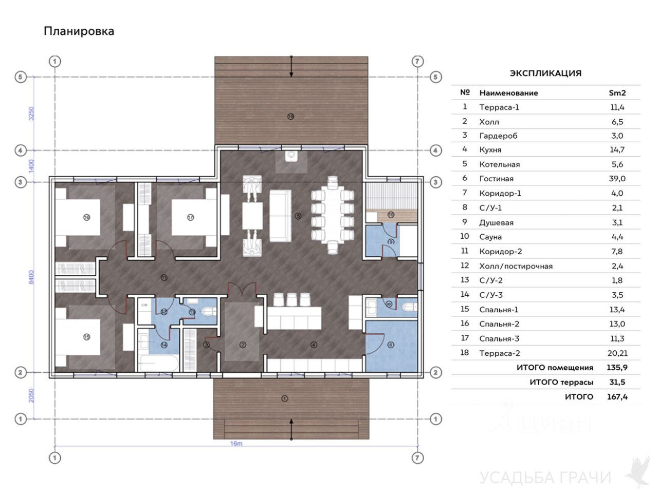 Общая площадь дома 167,40 м2 (в том числе крыльцо и терраса 31,5 м2)