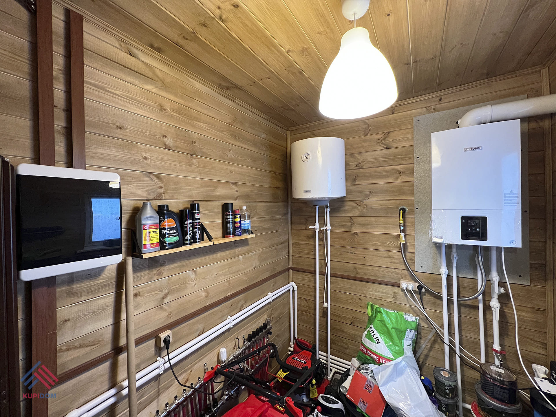 Отопление от магистрального газа; заведен и подключён; котельная оборудована газовым котлом BOSCH; Интернет оптоволокно; Теплый пол по первому этажу, дополнительно установлены радиаторы; Электричество 15 кВт 380 В, подключено и разведено по точкам потребления. Водоснабжение от индивидуальной скважины в кессоне, глубиной ~70 метров; Канализация - биосептик 5; Установлена сантехника в двух с/у; Интернет - оптоволокно.