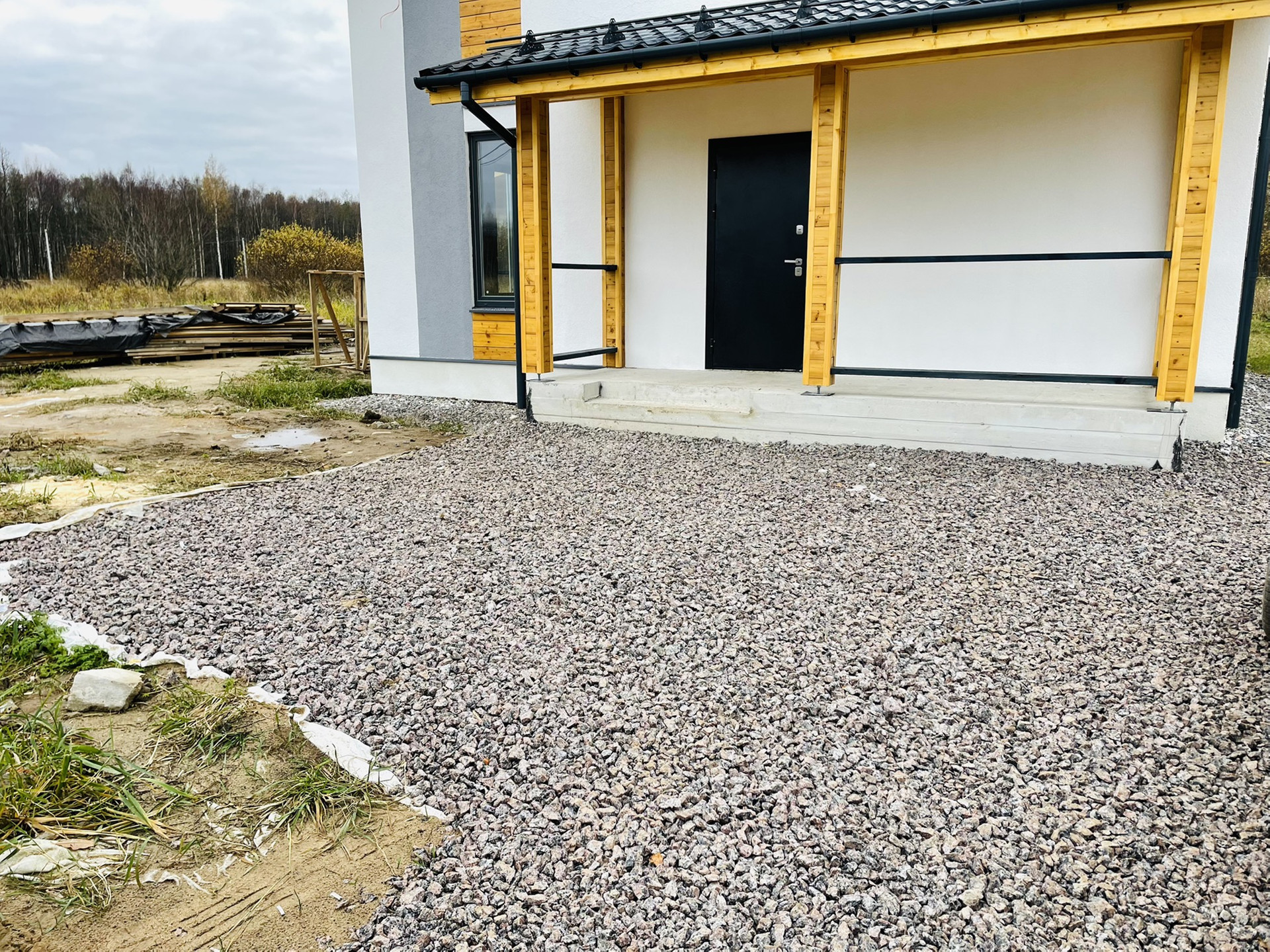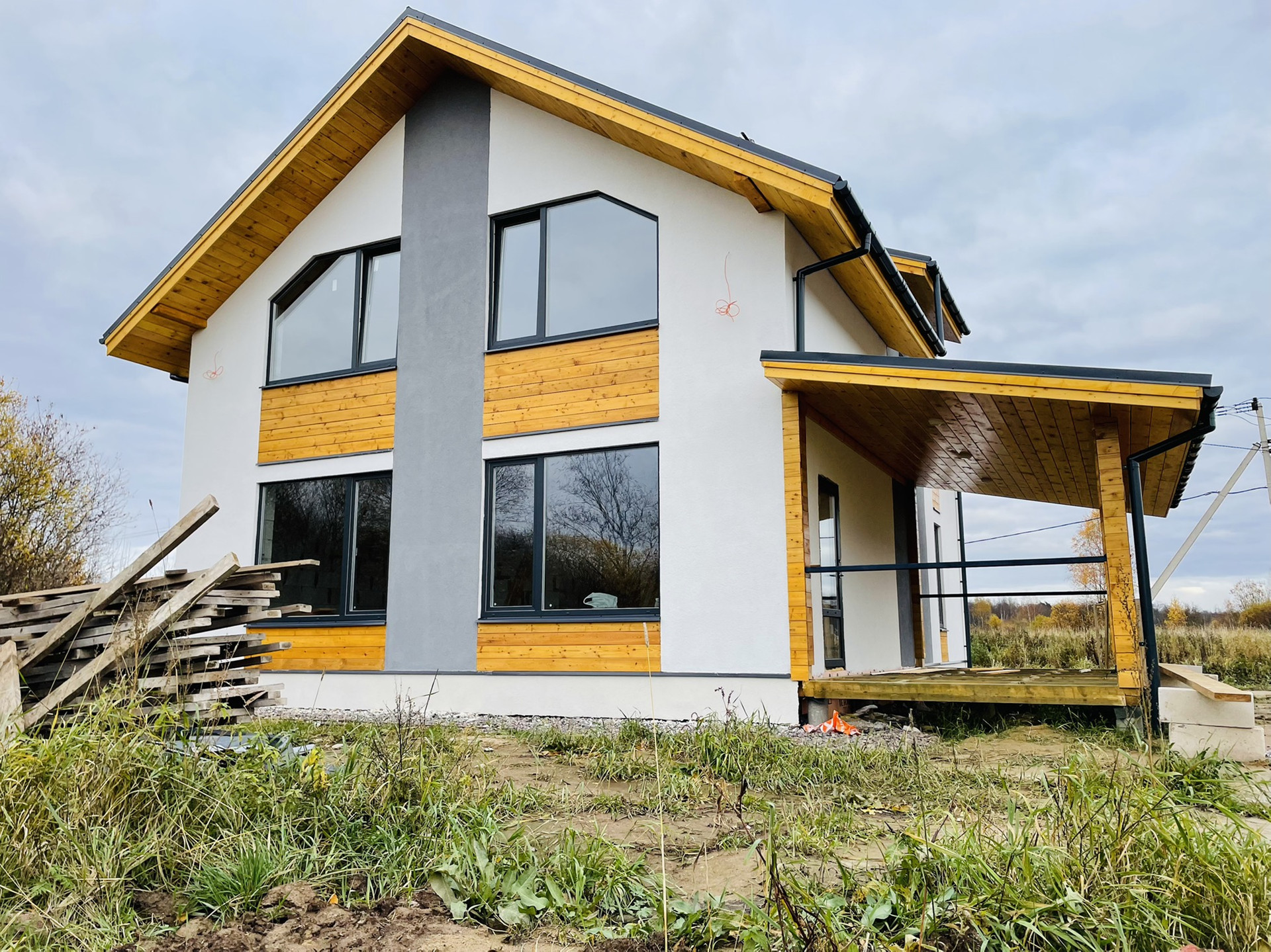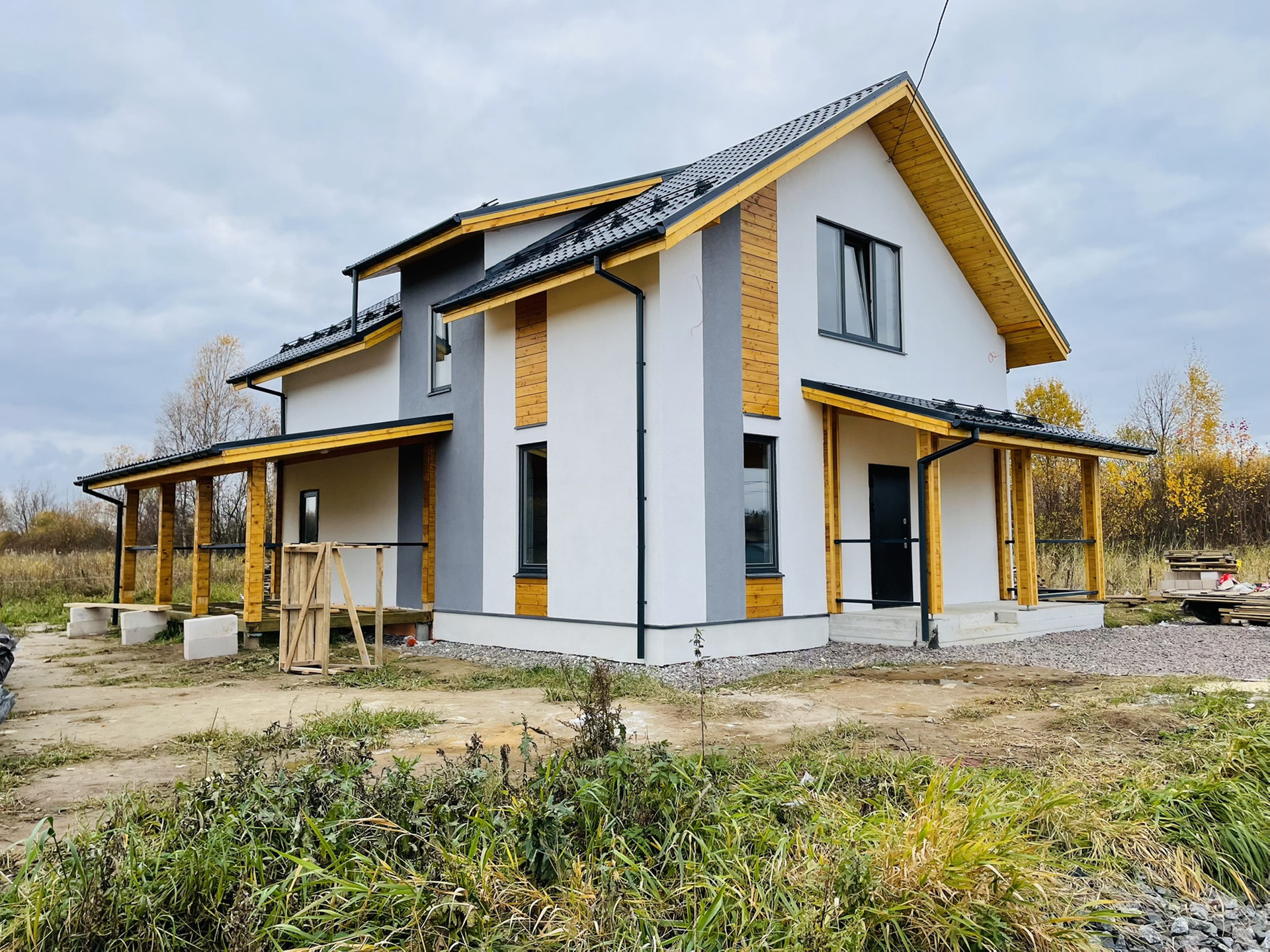 Материал дома газобетон. Покрытие штукатурка, краска. Цвет дома белый с желтыми и серыми вставками. Декоративные вставки-лиственница.