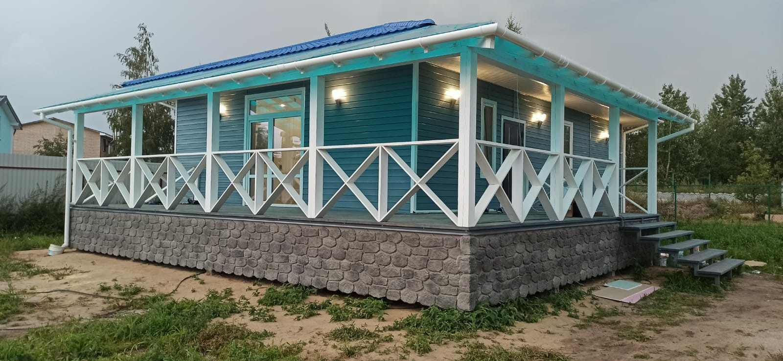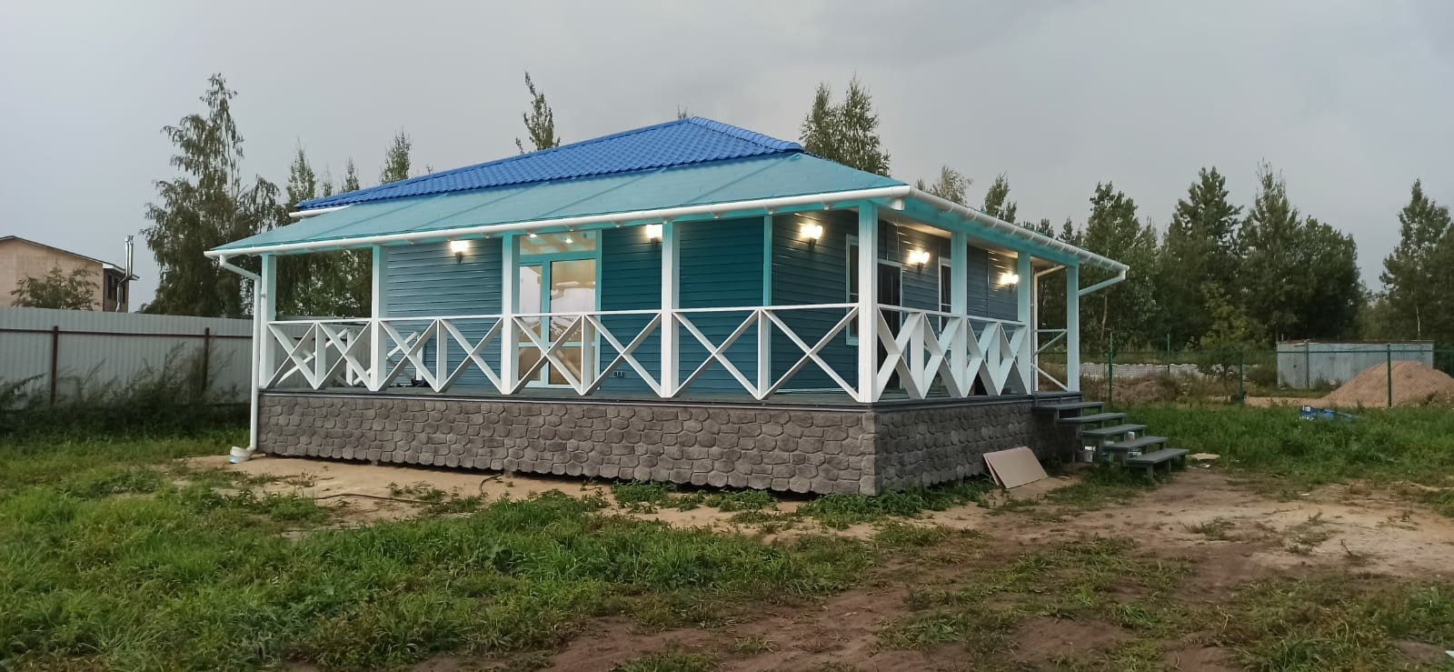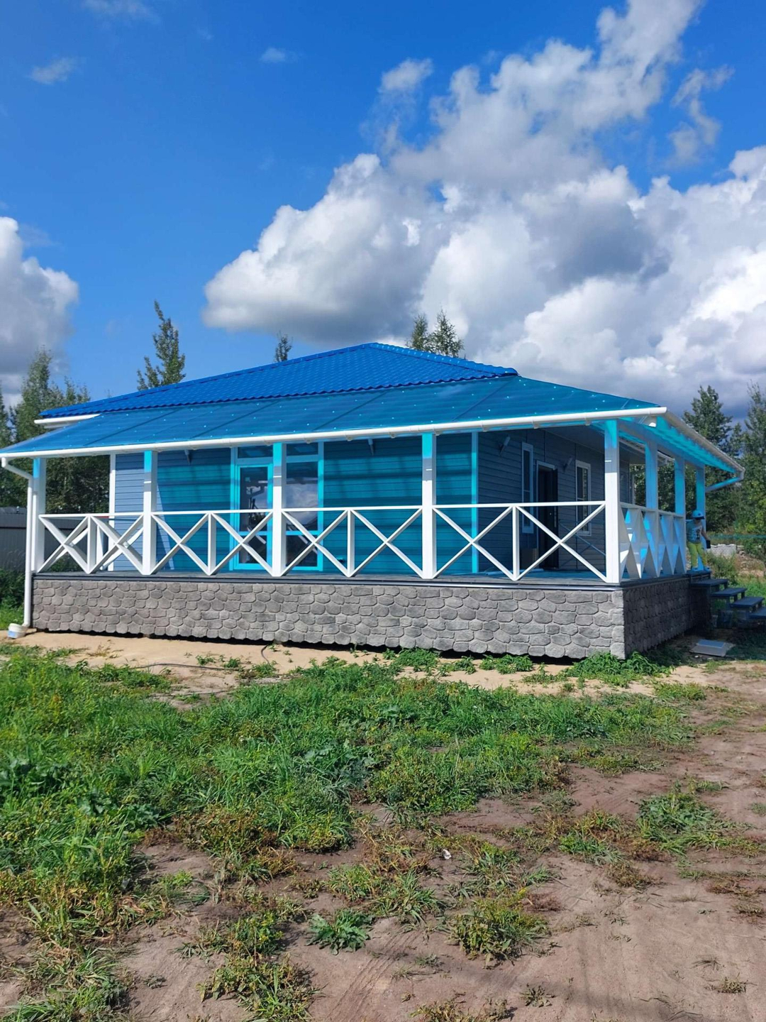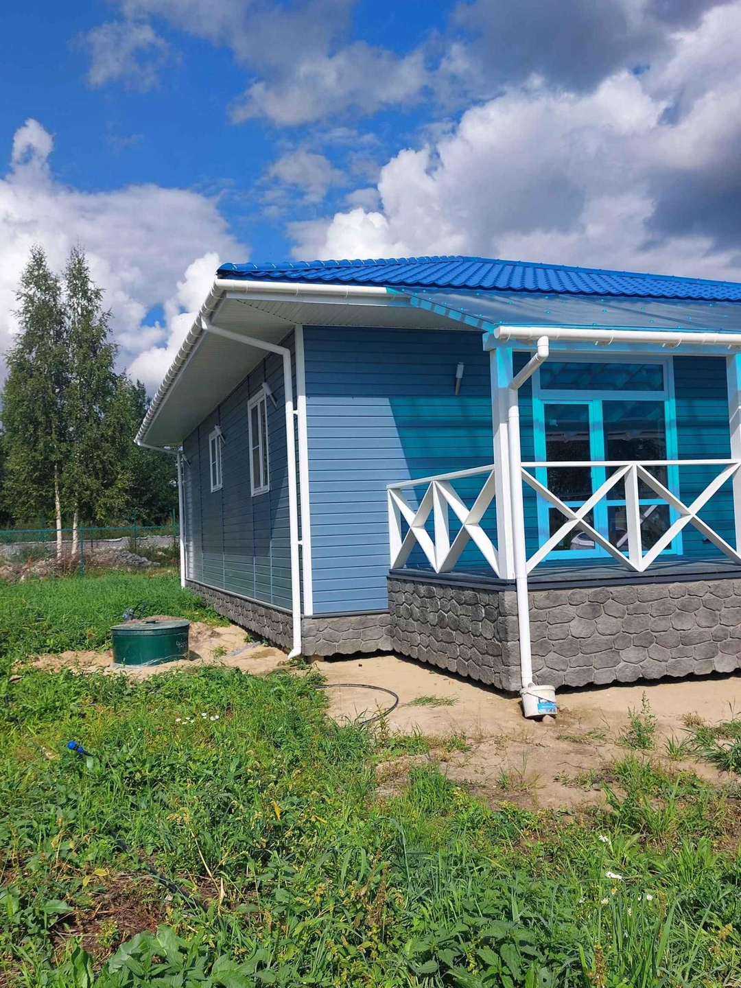 В доме три комнаты 13,13 и 11 метров, два санузла, кухня-гостиная с выходом на веранду 30 кв. метров, техническое помещение, прихожая, и "изюминка" дома большая 40 метров веранда с двух сторон. Потолки в доме высотой 3 метра.