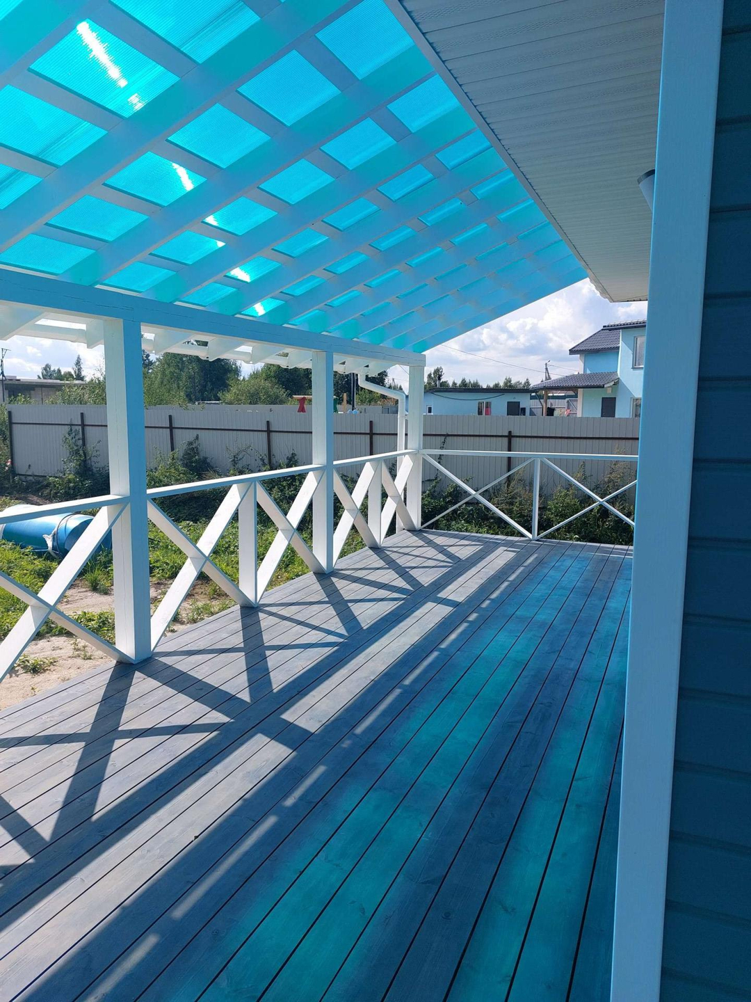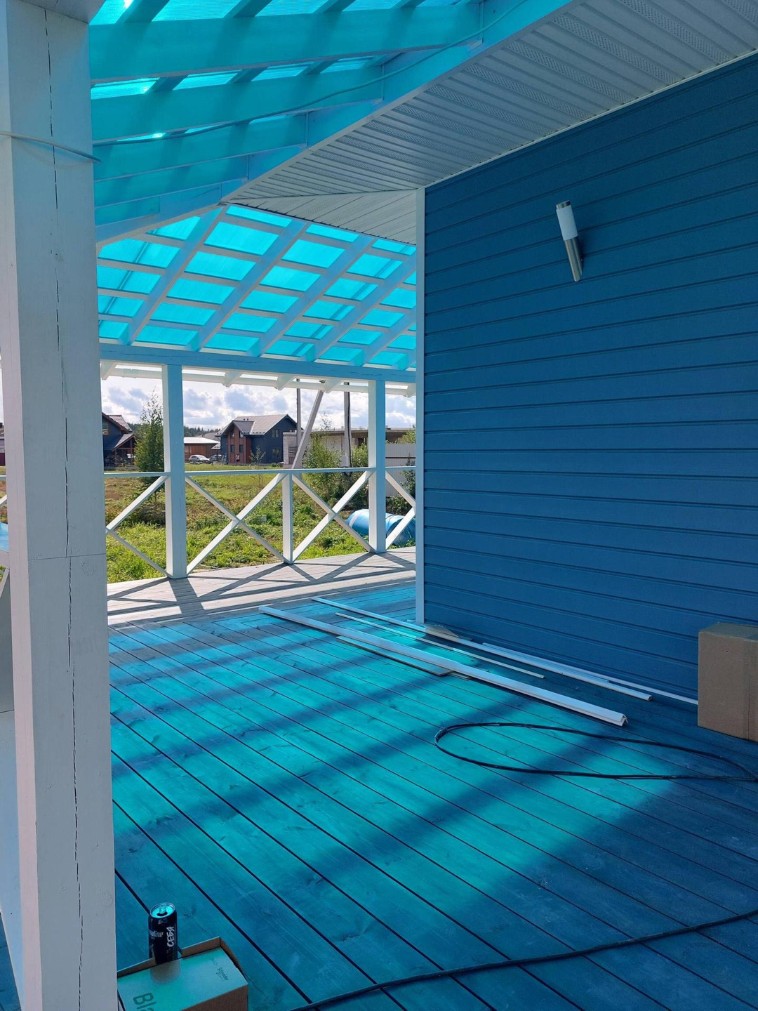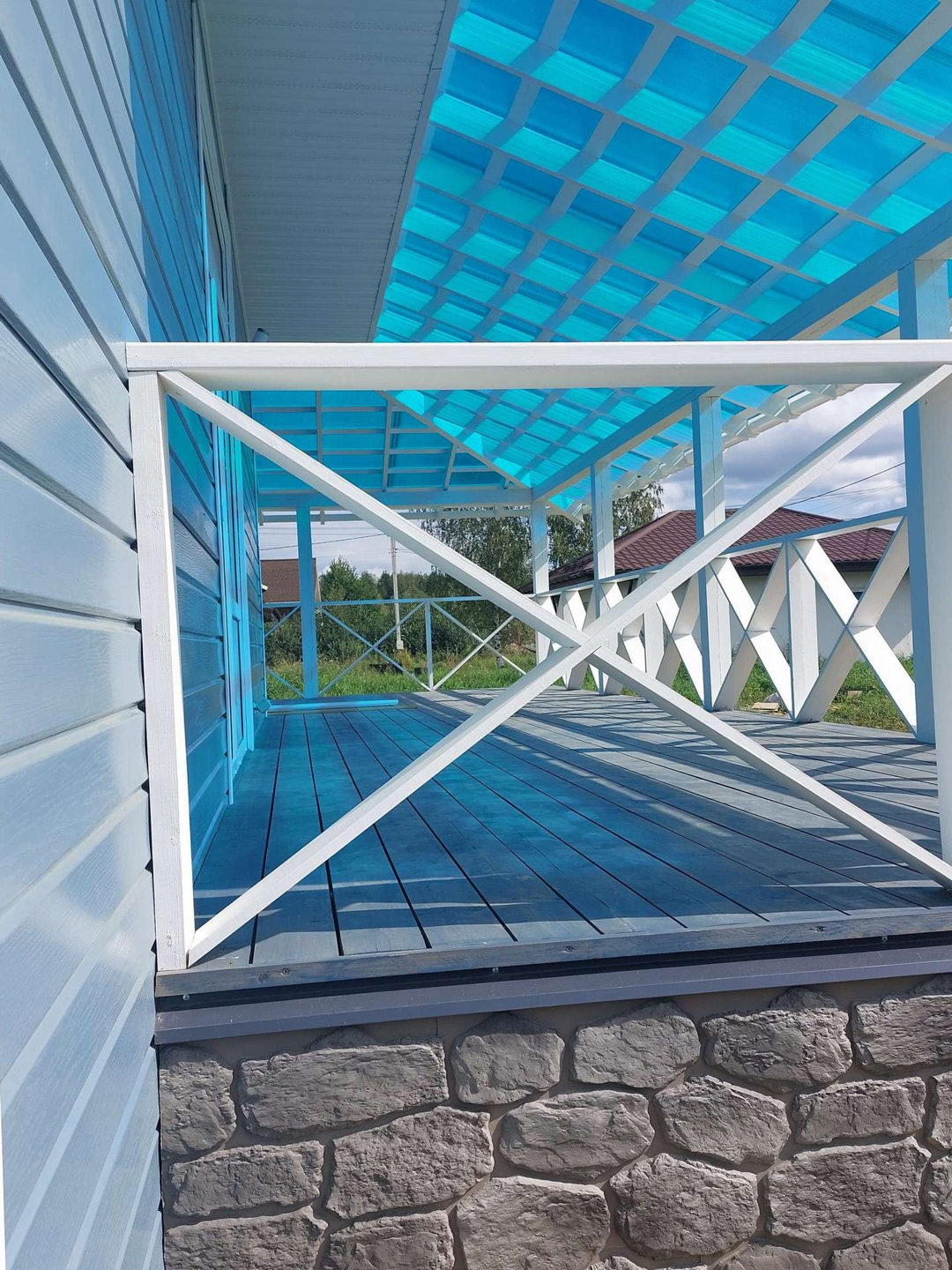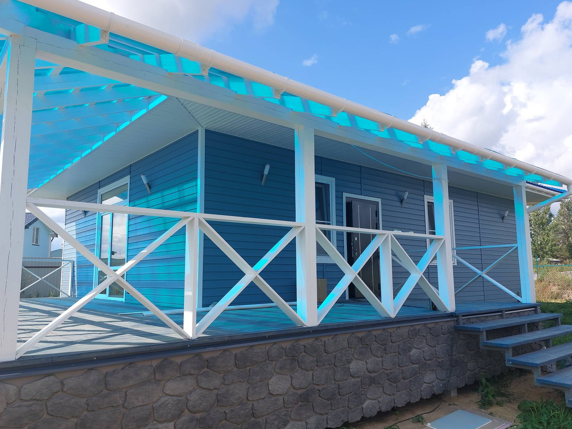 В доме три комнаты 13,13 и 11 метров, два санузла, кухня-гостиная с выходом на веранду 30 кв. метров, техническое помещение, прихожая, и "изюминка" дома большая 40 метров веранда с двух сторон. Потолки в доме высотой 3 метра.