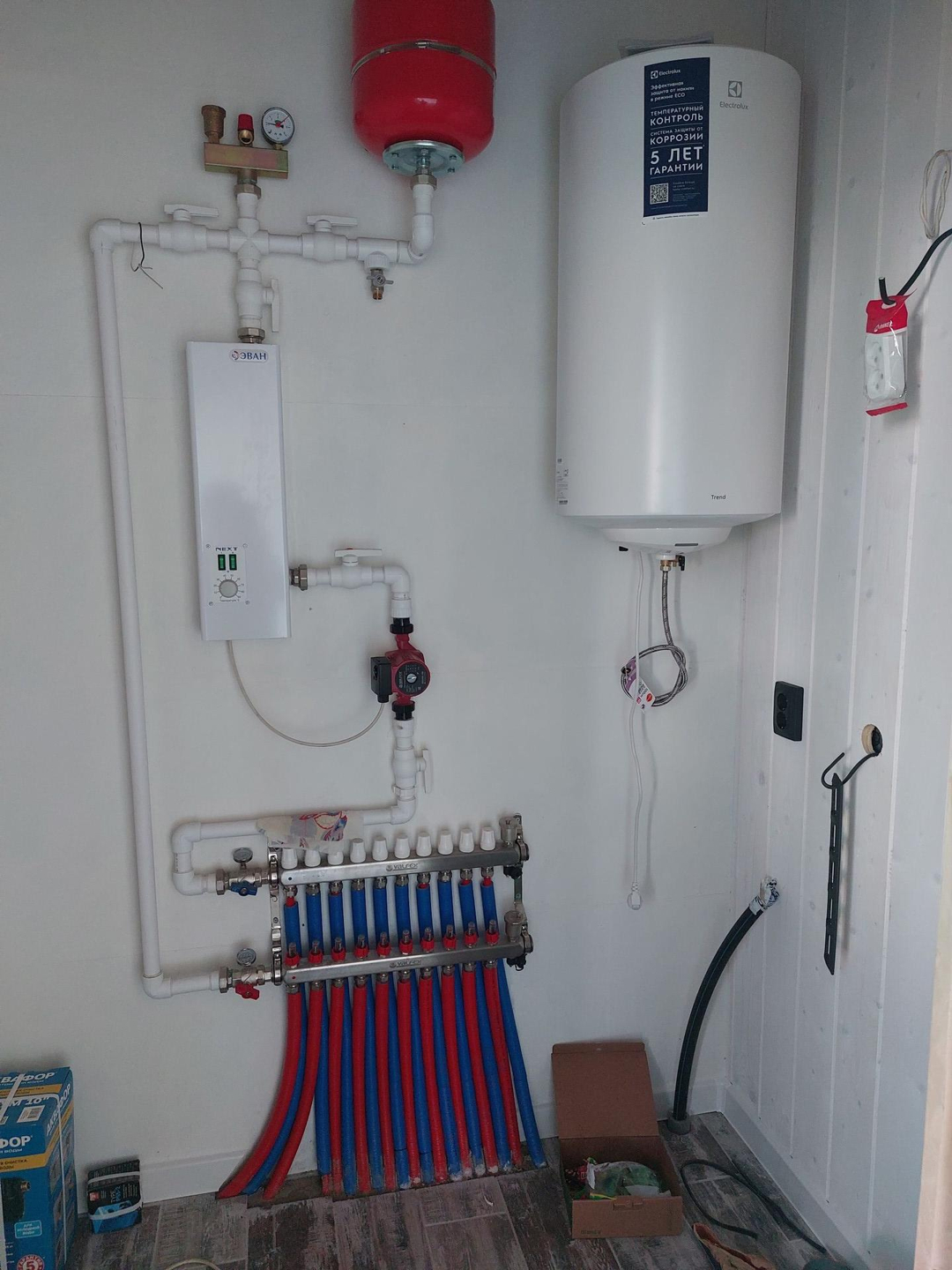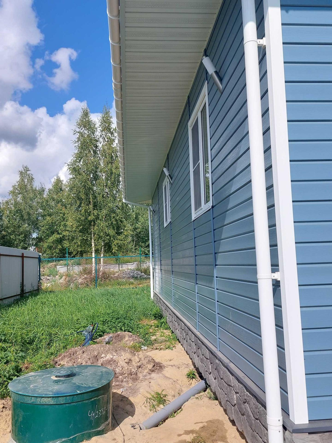 Из коммуникаций: электричество 15 кВт(разведено по всему дому, а так же выполнена подсветка дома светильниками), вода скважина 12 метров, септик Евролос 4+, по всему периметру дома тёплые водяные полы, установлен котёл на 7 кВт.