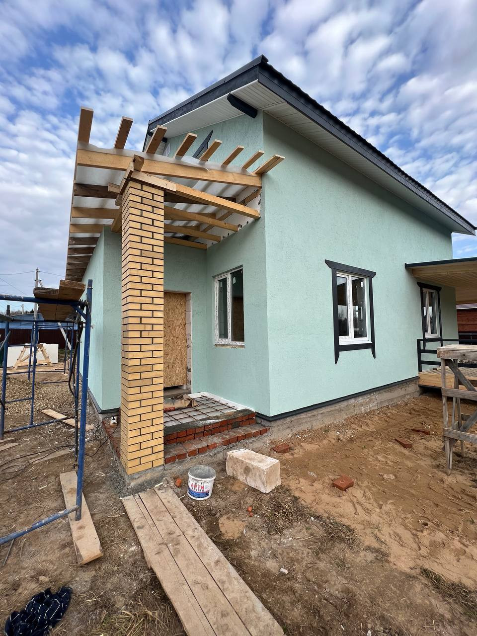 Дом построен из газобетонных блоков с утеплением, фасад - декоративная штукатурка короед, фундамент 9×11 м. железобетонная плита с углублением под землей в 1 м.