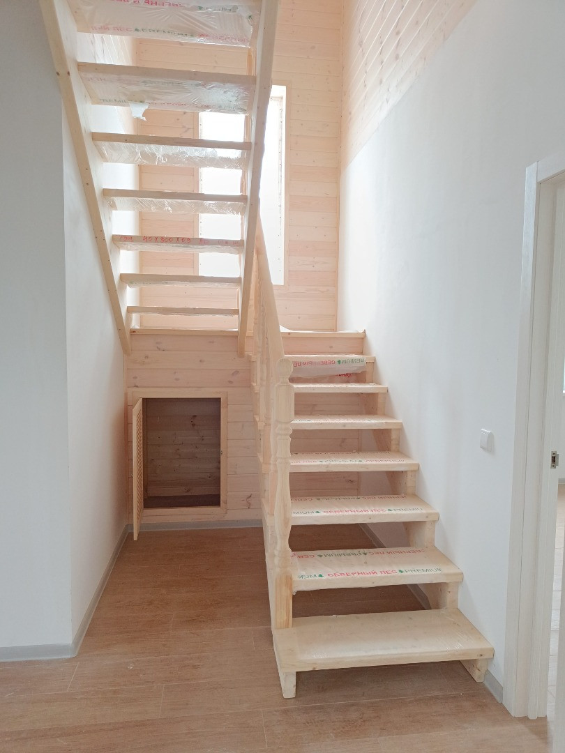 - холл с лестницей на второй этаж и кладовой под лестницей.