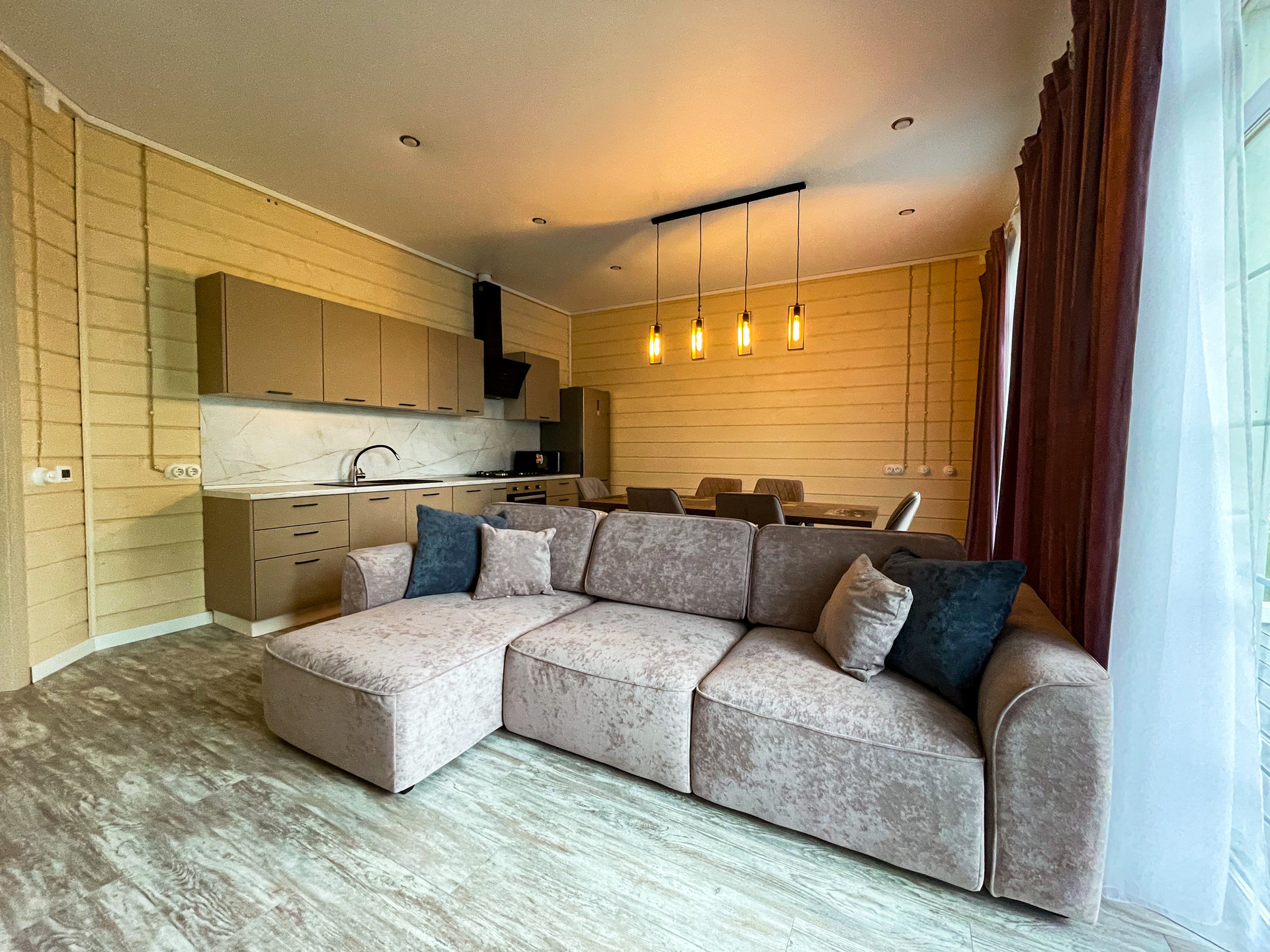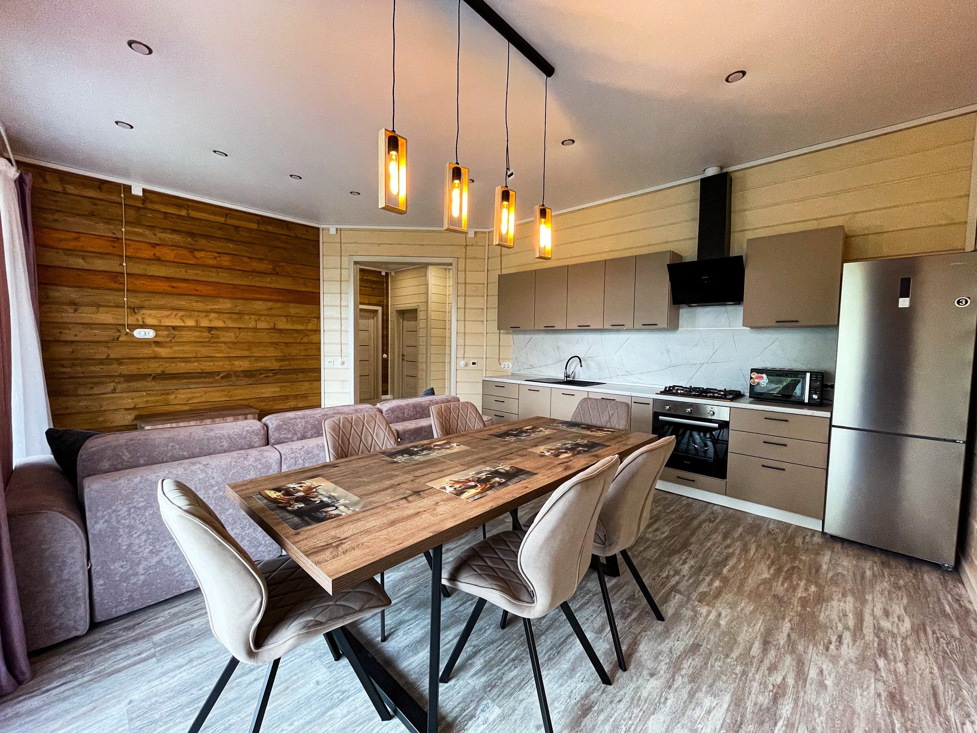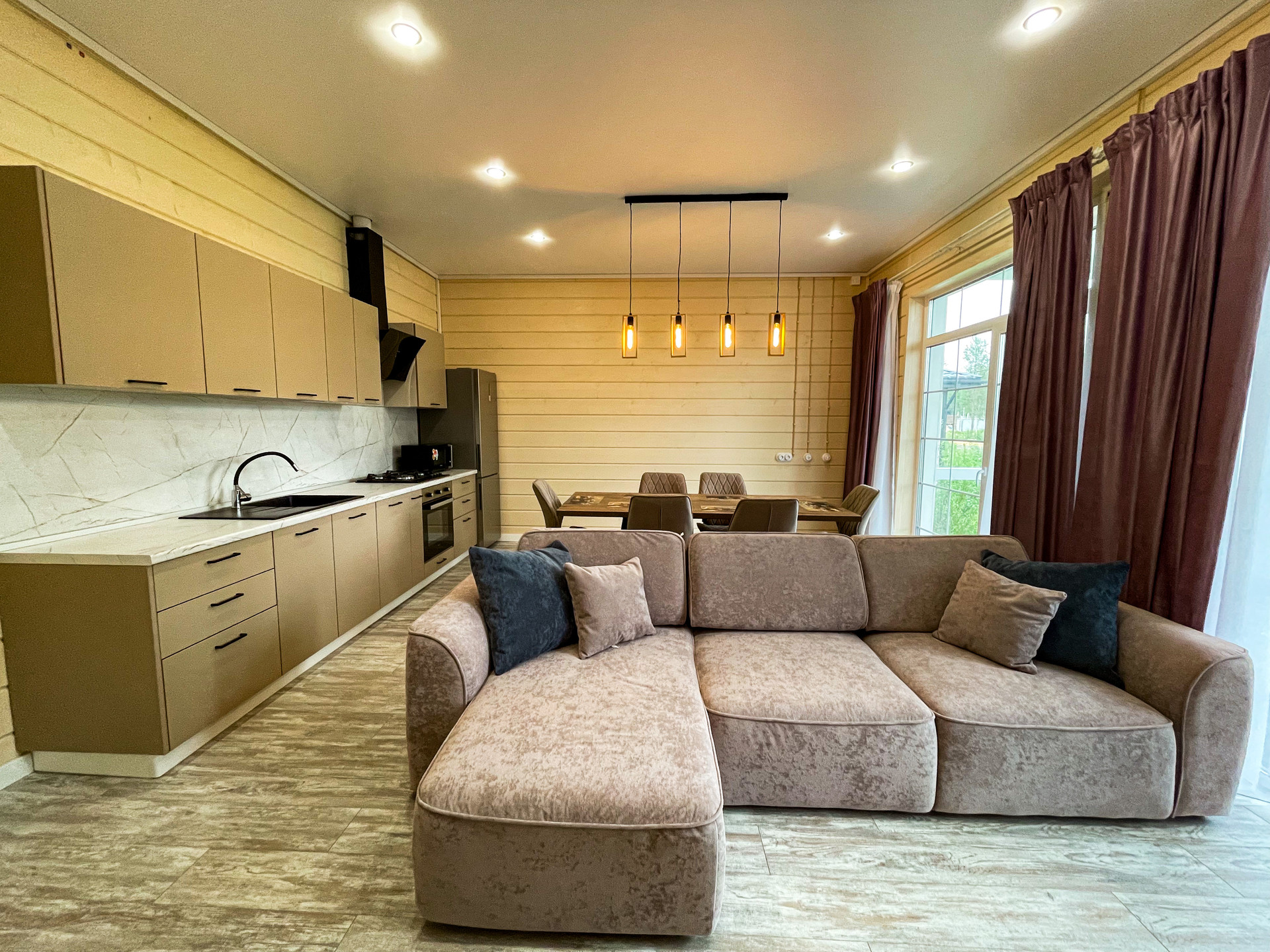 Отделка в светлых тонах с использованием материалов натурального дерева. Теплые (инфракрасные) полы. Дом укомплектован кухонным гарнитуром, мягкой мебелью в гостиной, мастер спальня с кроватью. Дом готов для проживания.