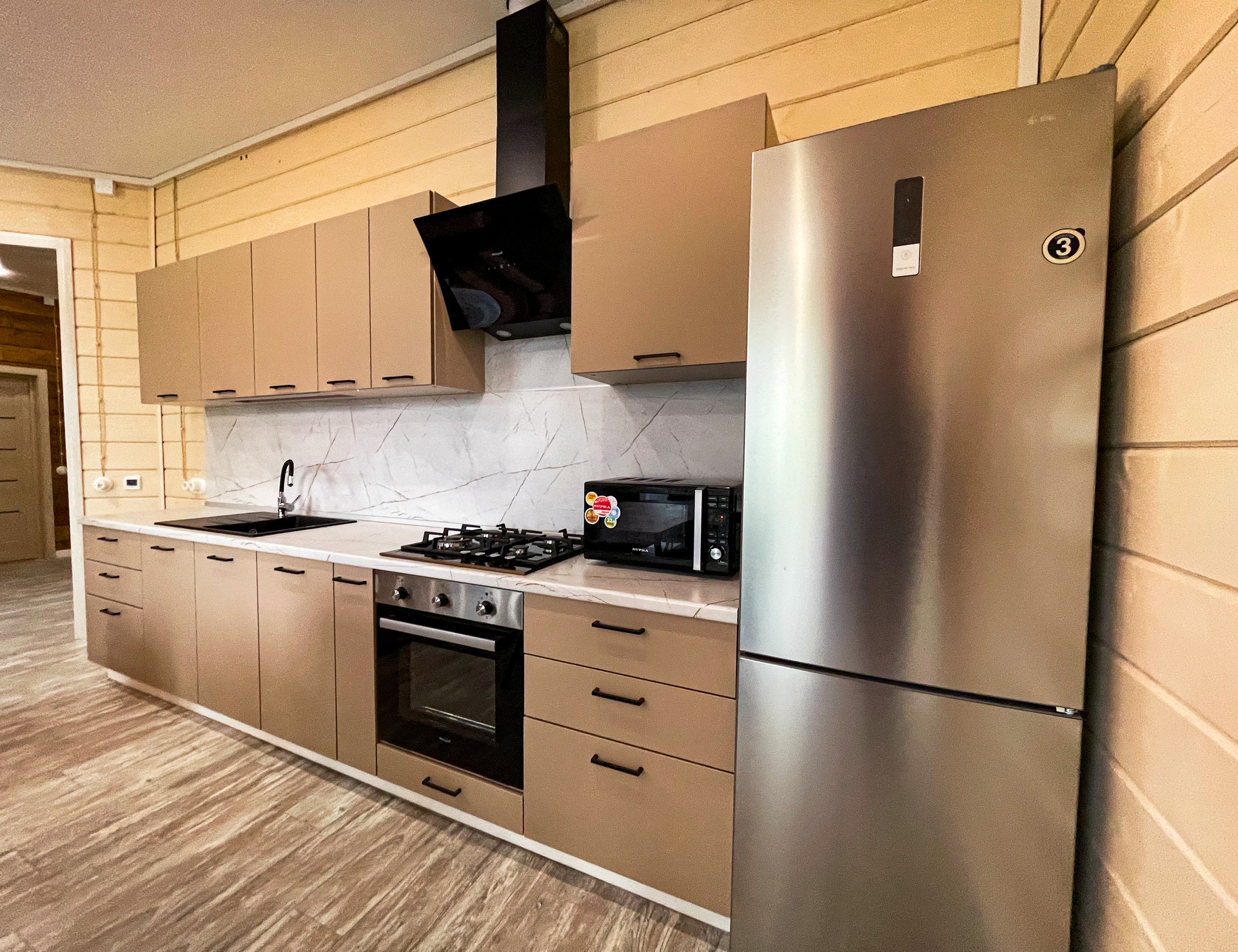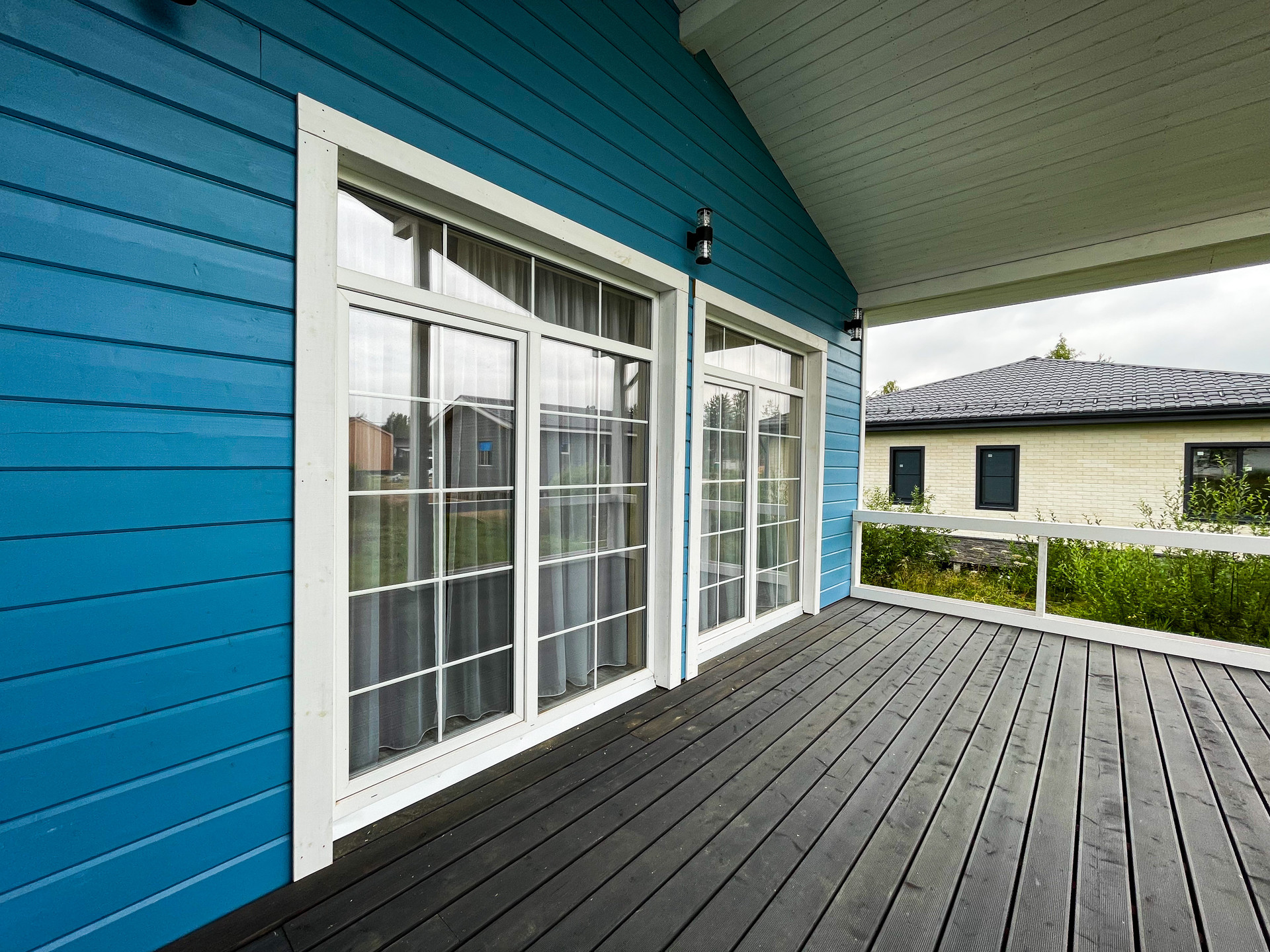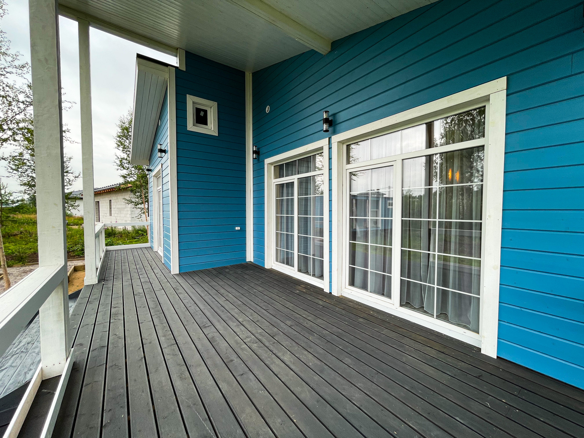В доме есть большая терраса и два выхода из просторной зоны для отдыха совмещённой с кухней (Гостиная + кухня), в едином стиле. Кухня - гостинная ~ 27 кв.м с панорамным остеклением. Дополнительно имеется 3 отдельные комнаты, которые могут быть использованы, как под спальни, так под детскую или кабинет. Оборудованная ванная комната 6,5 кв.м.