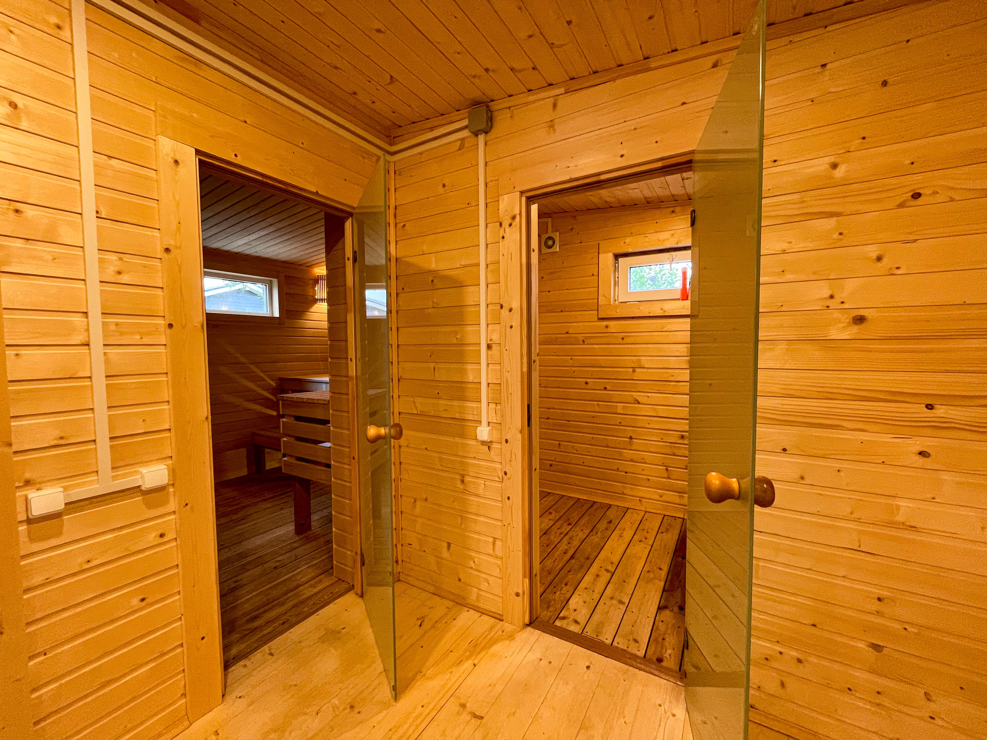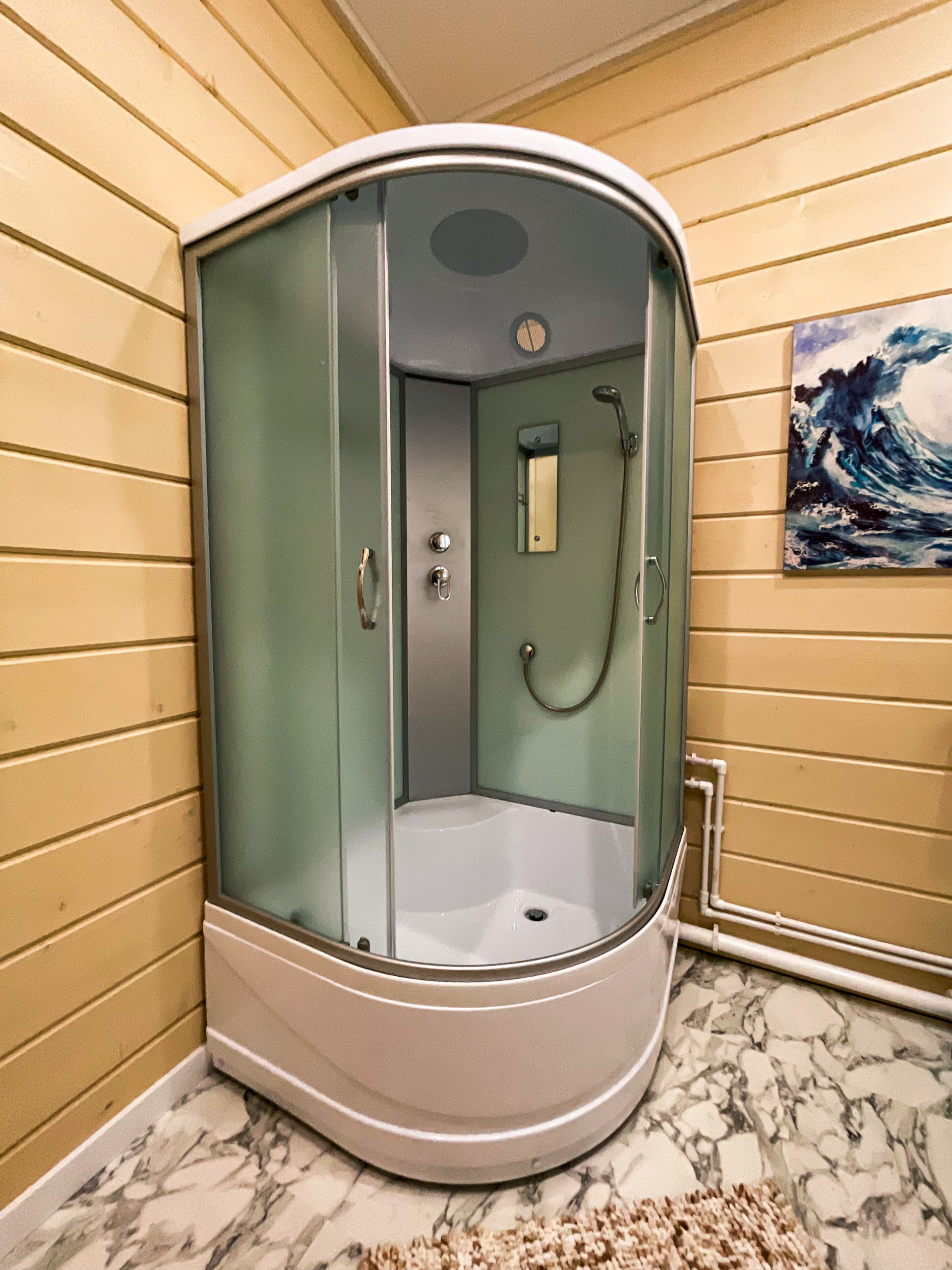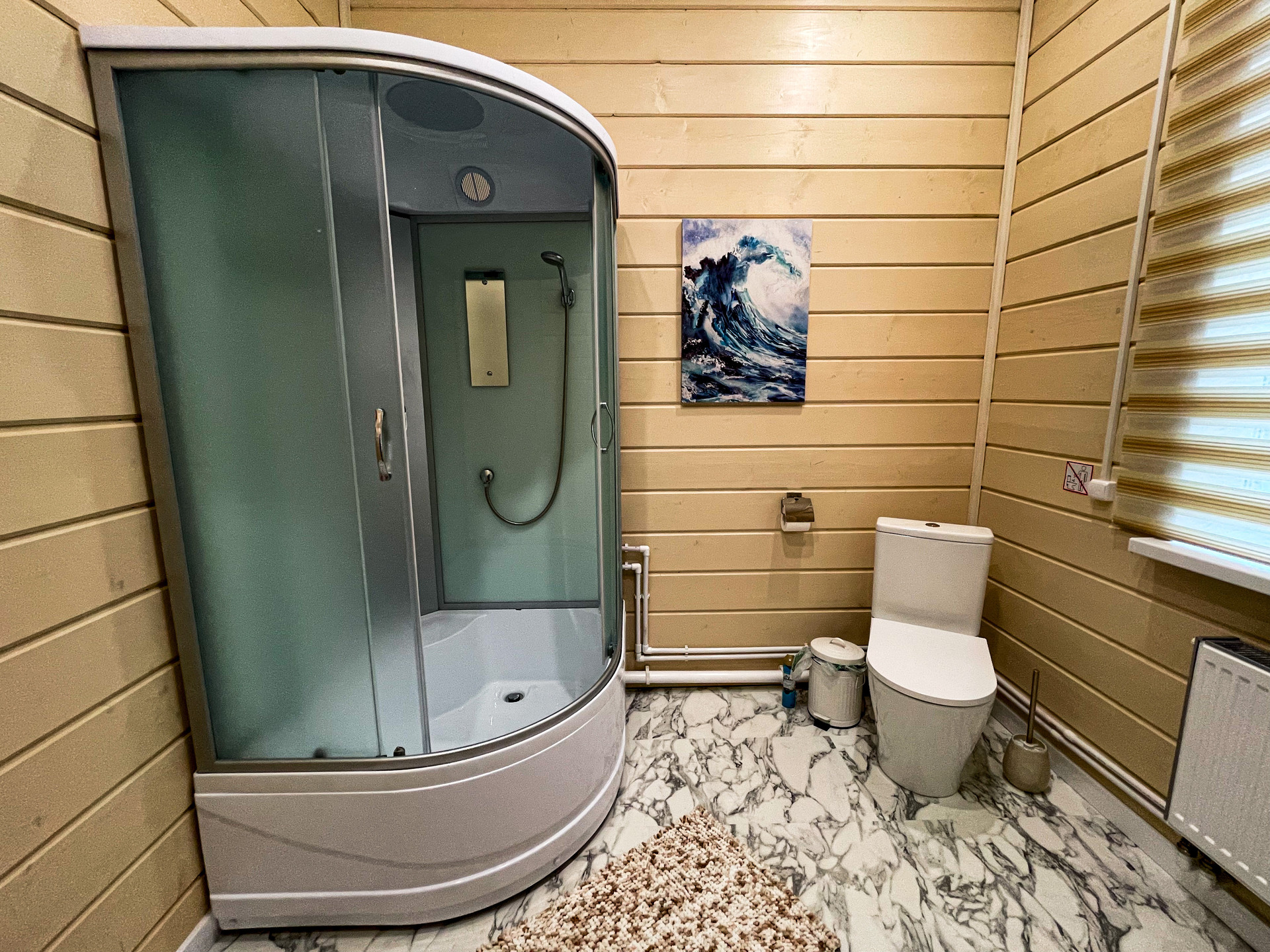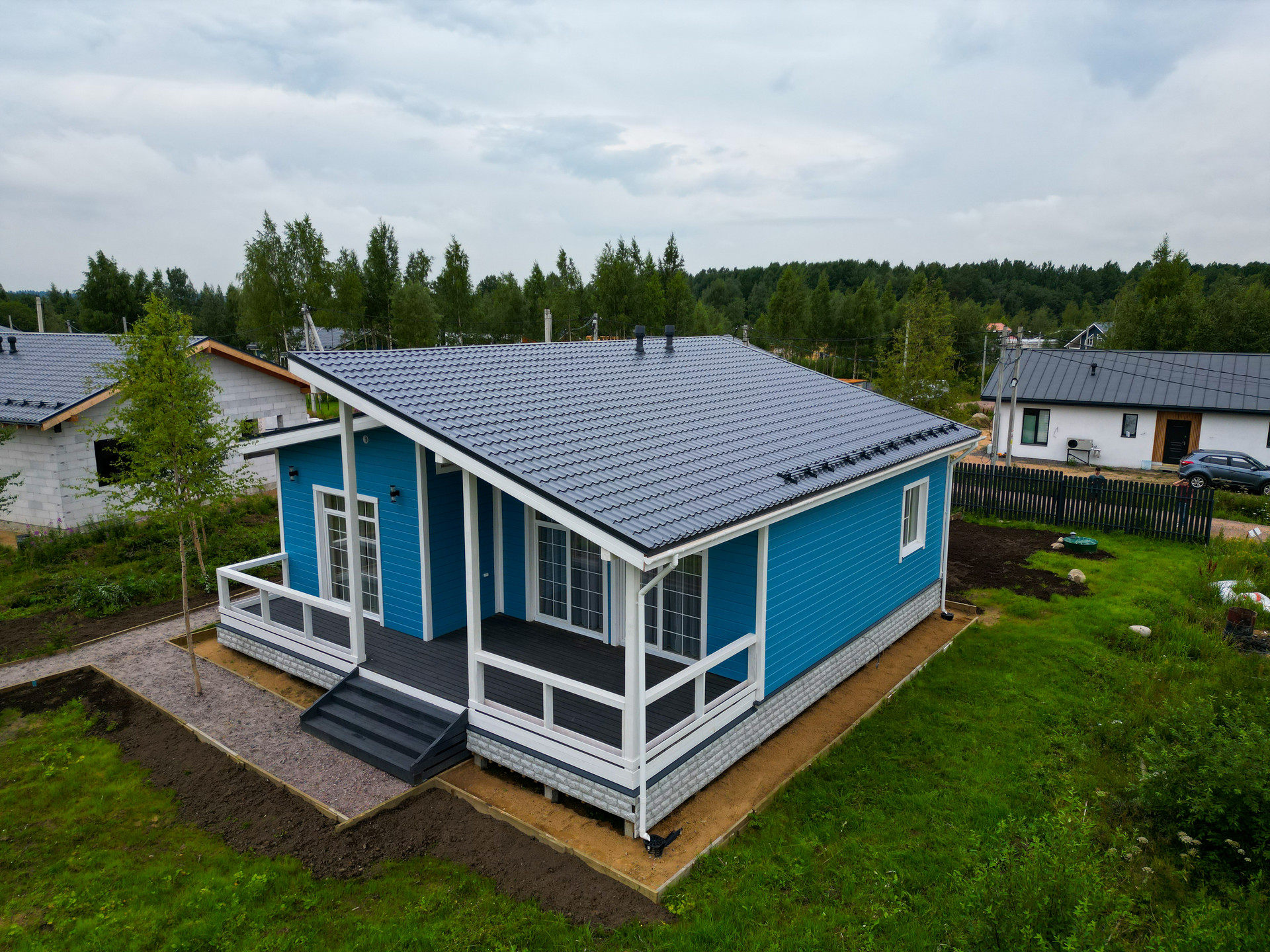 В доме есть большая терраса и два выхода из просторной зоны для отдыха совмещённой с кухней (Гостиная + кухня), в едином стиле. Кухня - гостинная ~ 27 кв.м с панорамным остеклением. Дополнительно имеется 3 отдельные комнаты, которые могут быть использованы, как под спальни, так под детскую или кабинет. Оборудованная ванная комната 6,5 кв.м.