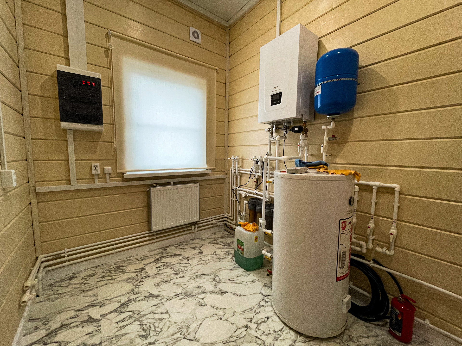 В котельной 6 кв.м. установлен ддвухноконтурный котел ВАХI Аmреrа Рlus 12 с удаленным управлением ВАХI Соnnеkt Рlus , бойлер косвенного нагрева на 150литров INОХ.