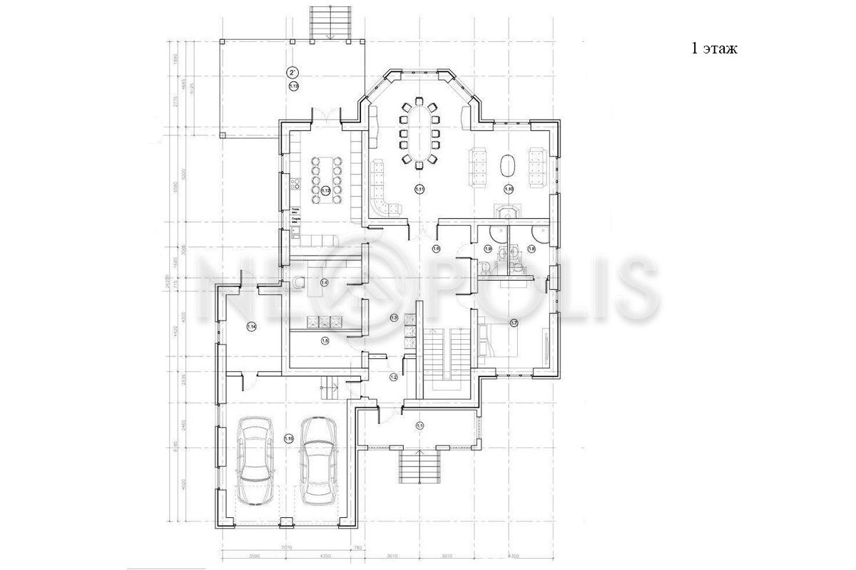 1 этаж: прихожая с гардеробной, кухня с выходом в остекленное патио с печью и мангалом, столовая с просторной гостиной и каминным залом 60 м², 2 спальни, санузел, гараж на 2 авто.