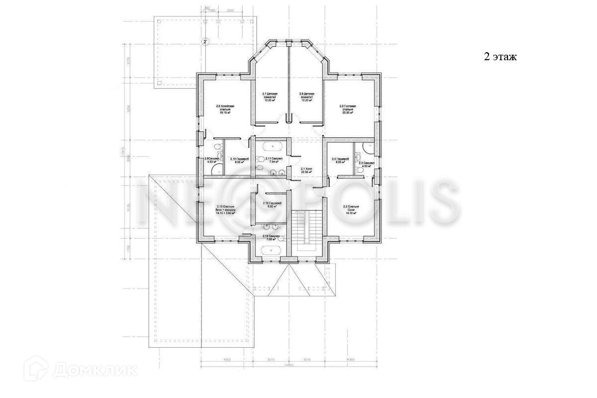2 этаж: 3 спальни с ванными комнатами и гардеробными, 2 спальни, кабинет, санузел.