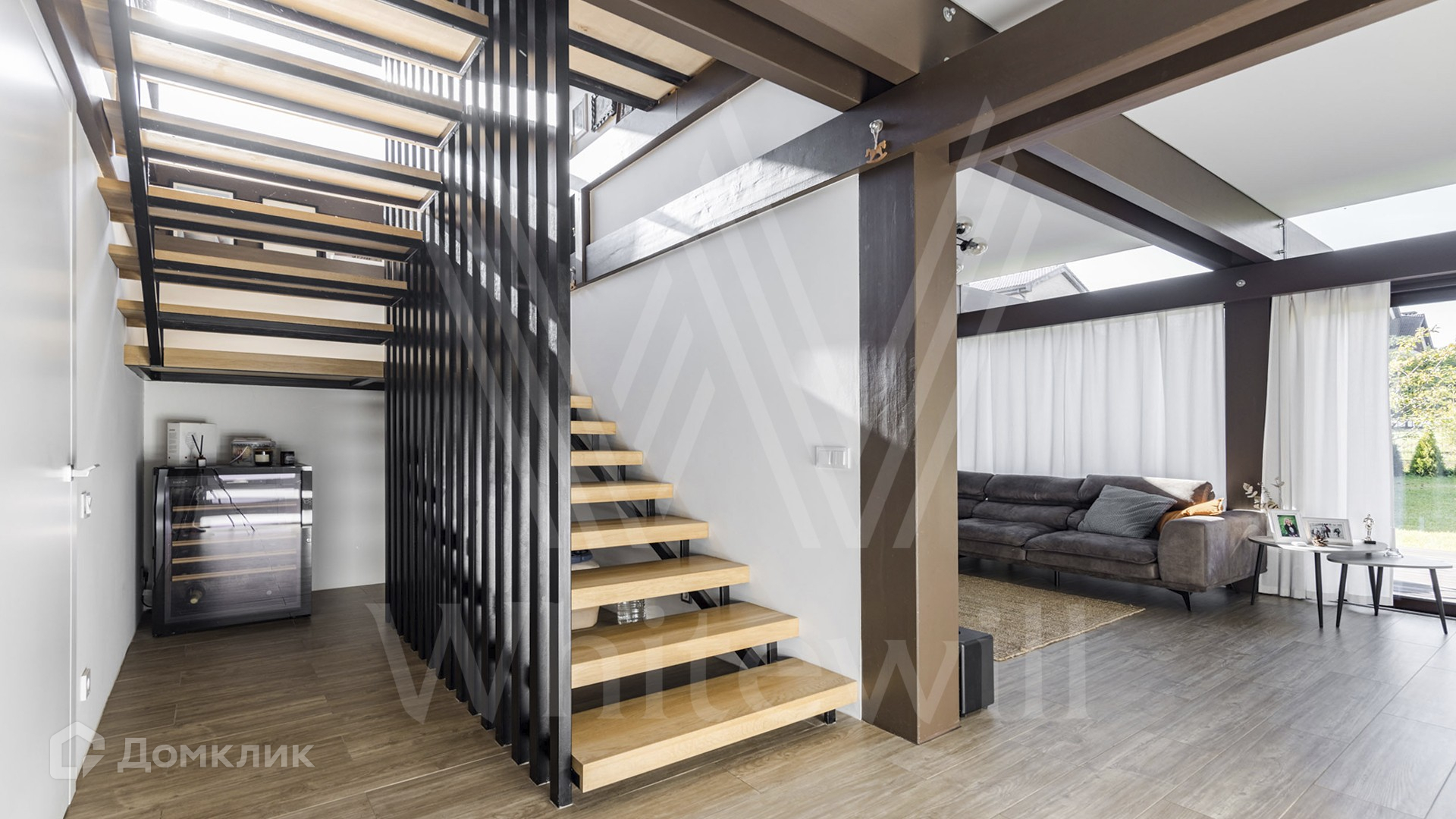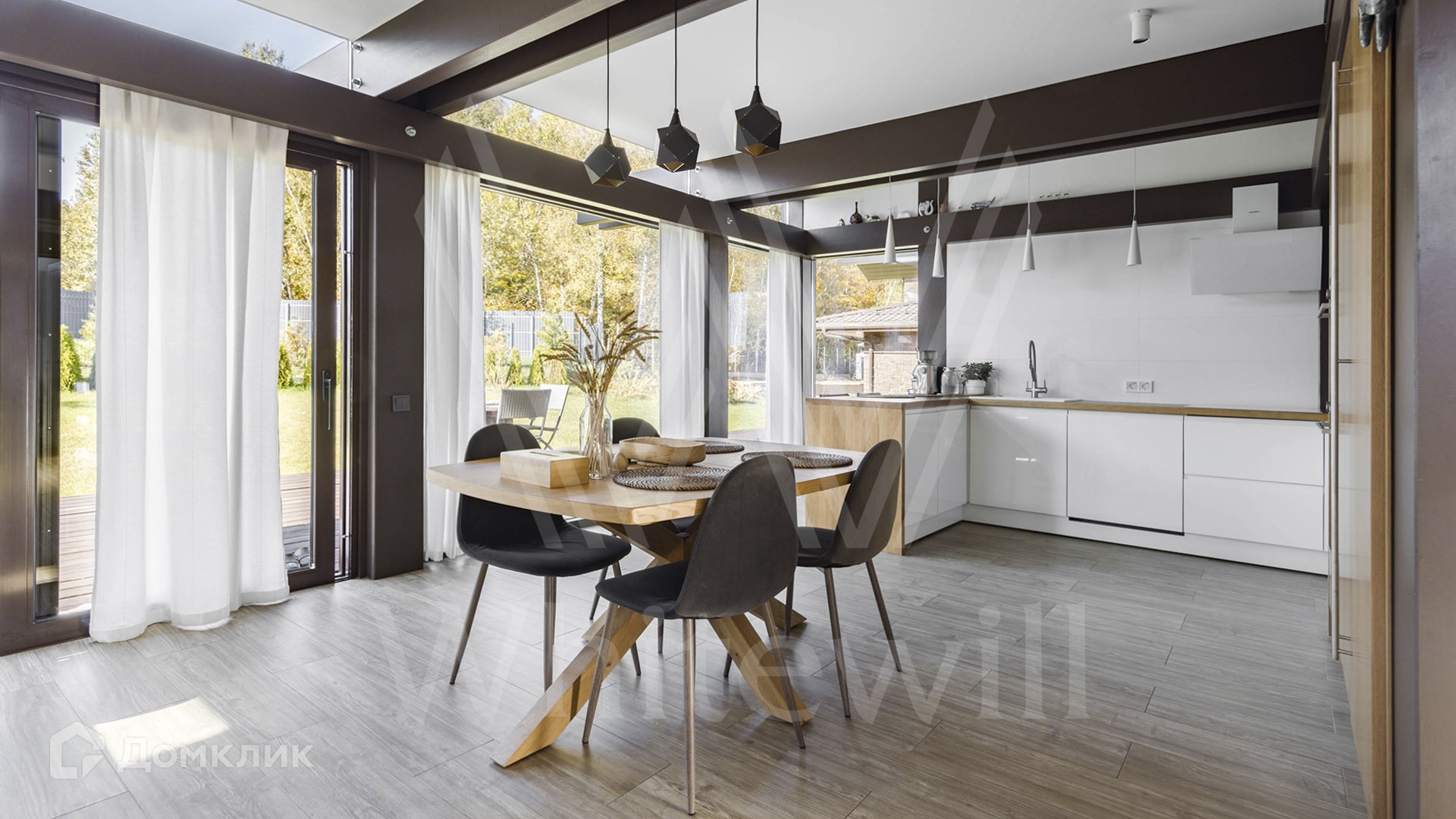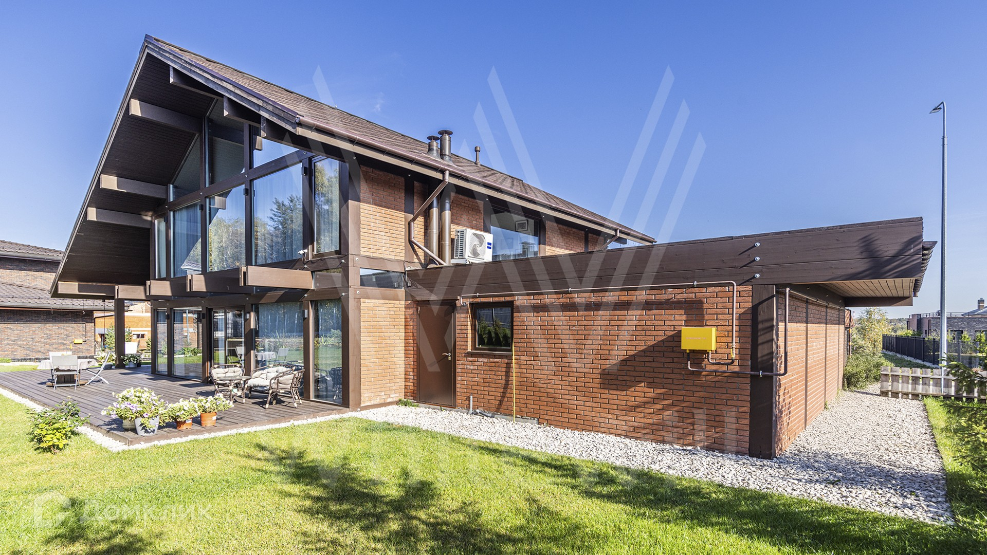 ID 12 862. Валуевская слобода. Загородный дом площадью 255 м² расположен на полевом участке правильной формы 8,5 соток. Современный фасад с панорамным остеклением и подсветкой выполнен в стиле «фахверк».