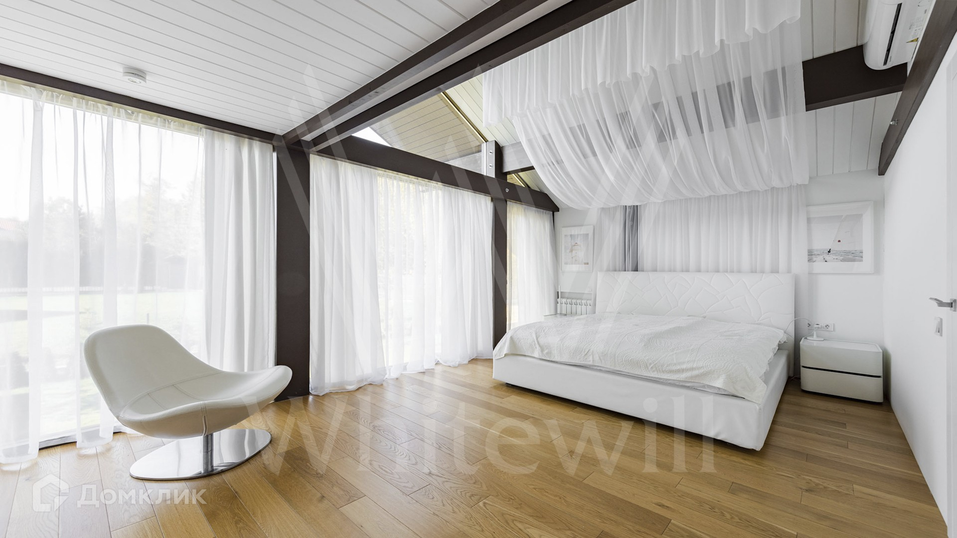 Наполненный воздухом интерьер выдержан в спокойных оттенках, отделан с использованием натуральных материалов и дополнен стильной мебелью. В коттедже спланировали просторную гостиную с камином, совмещенную с полностью оборудованной кухней-столовой, 5 спален и кабинет с панорамным видом. Также для удобства будущих владельцев в контуре дома предусмотрен гараж. На территории, в едином стиле с основным зданием, построена баня.