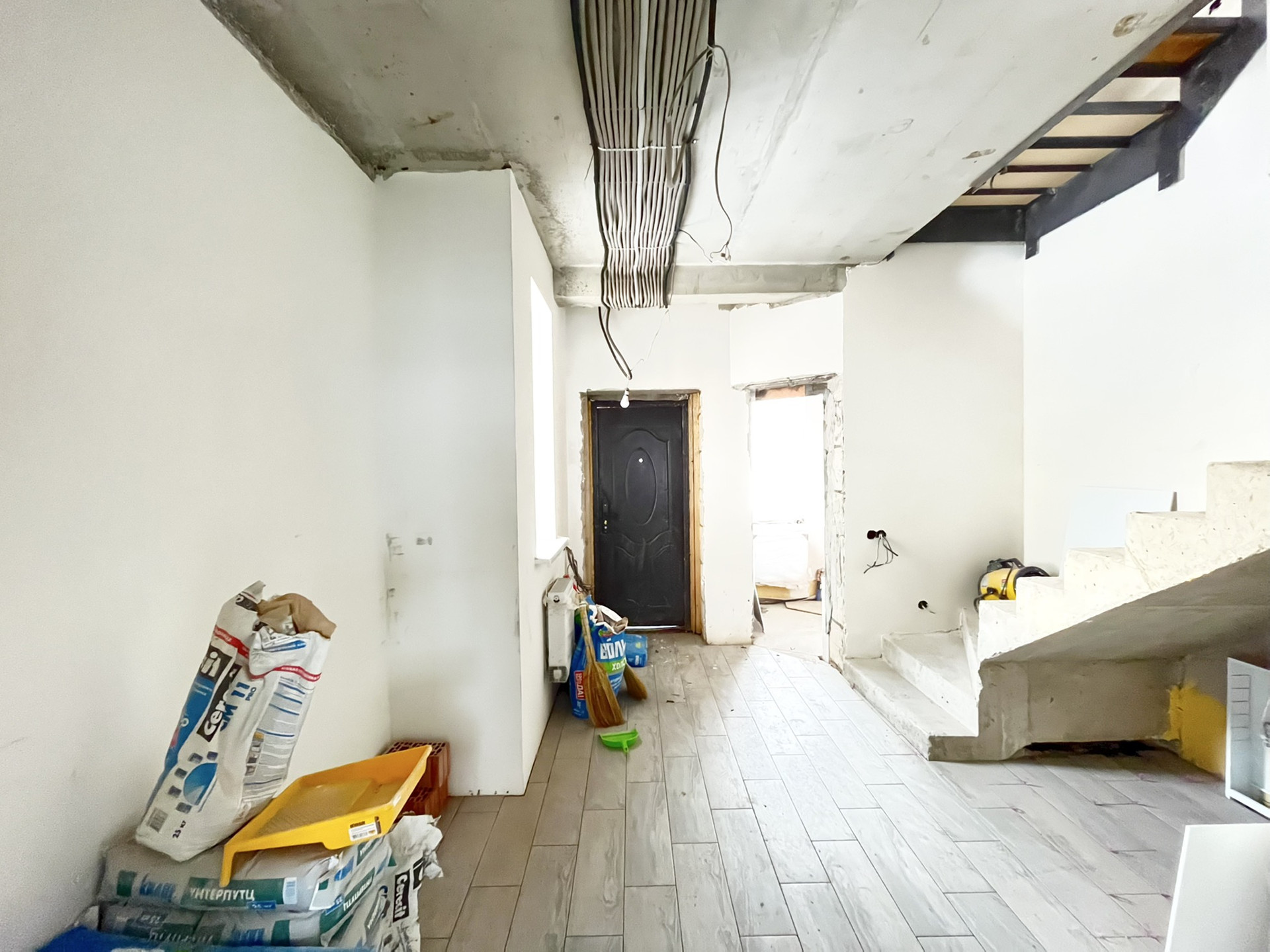 В доме выполнена предчистовая отделка, что позволит реализовать Ваши фантазии в дизайне. Для ремонта были использованы качественные материалы. Стены и отштукатурены и подготовлены под покраску. Перекрытие между этажами дополнительно усилили. Выполнена разводка электрики, систем отопления, водоснабжения и канализации. Газ проведён до участка МосОблГазом. На первом этаже, в санузлах первого и второго этажа тёплый пол, покрытие - керамогранит.
