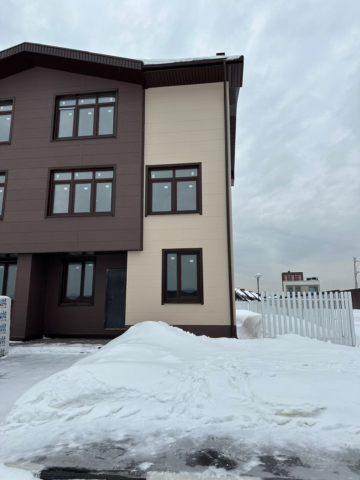 Вашему вниманию предложение в КП ВАРЕЖКИ-3 - Таунхаус (Б2) площадь 170м2 + 2 сотки земли. Дом без отделки  свободной планировки. Участок правильной формы, огорожен белым евроштакетником + парковочное место у крыльца.