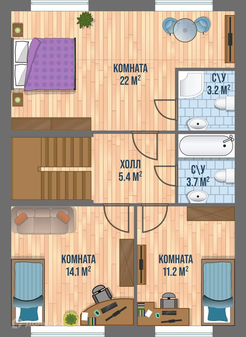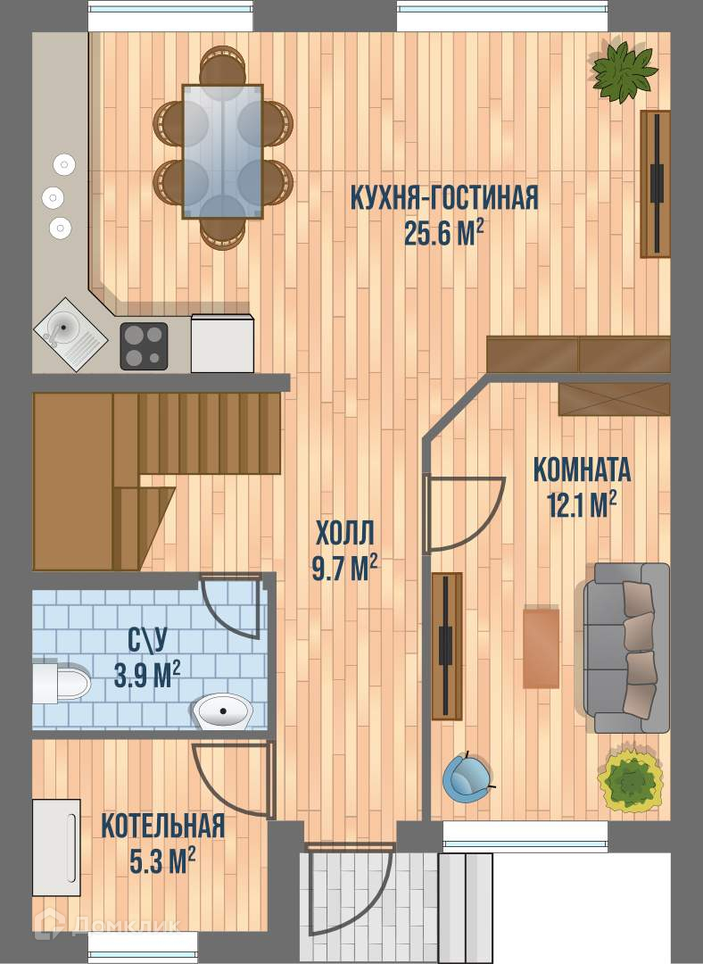 Жилая площадь 70 м2, кухня 16 м2, комнат 4, 2 этажа. Земельный участок 210 м2, парковка на 1 автомобиль.