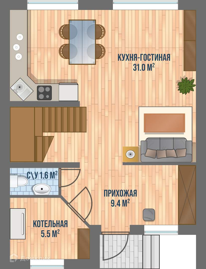 Жилая площадь 51 м2, кухня 21 м2, комнат 3, 2 этажа. Земельный участок 196 м2, парковка на 1 автомобиль.