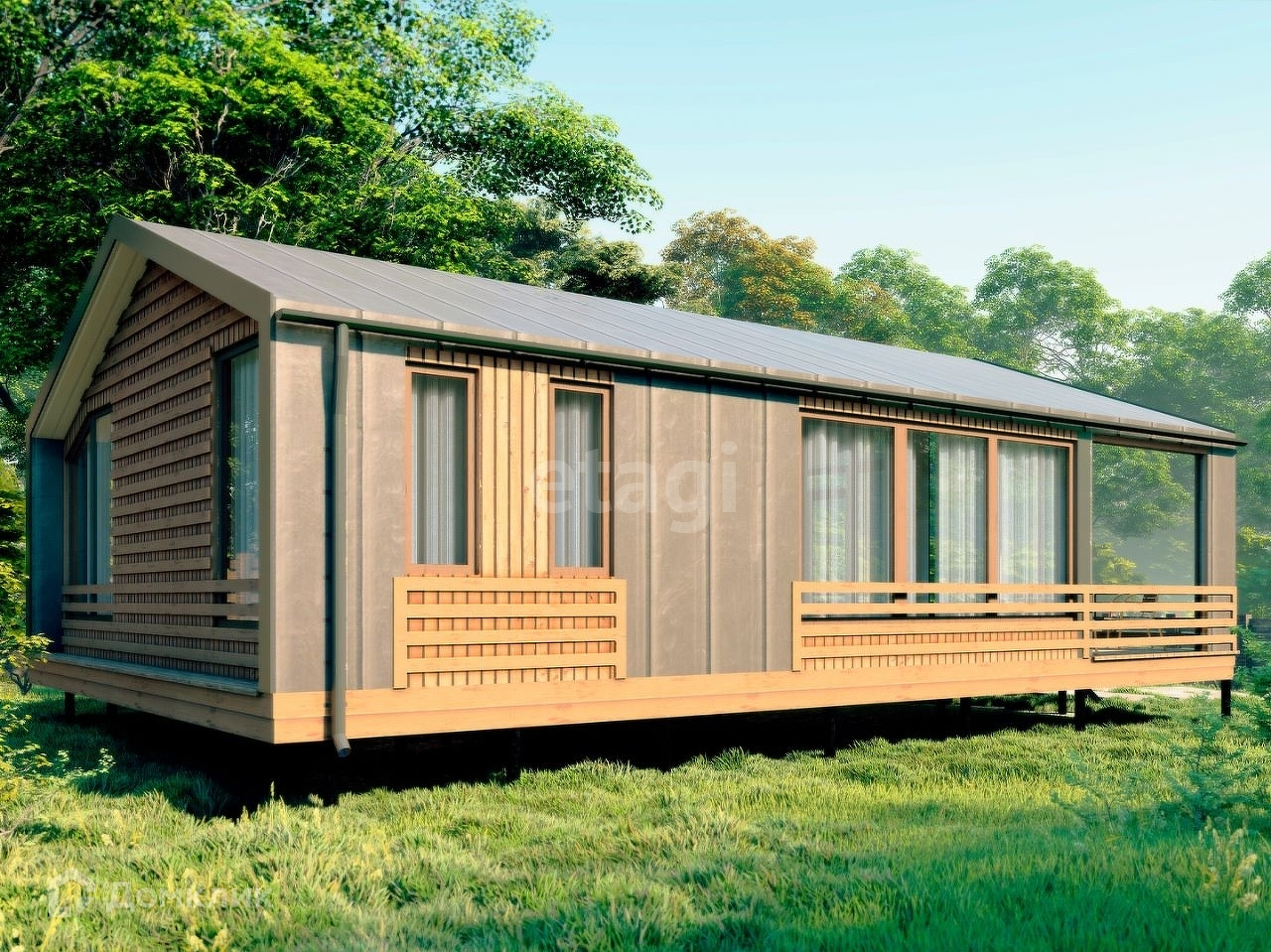 В отделке фасада используются фибрабетоные панели, декоративная штукатурка, планкен.