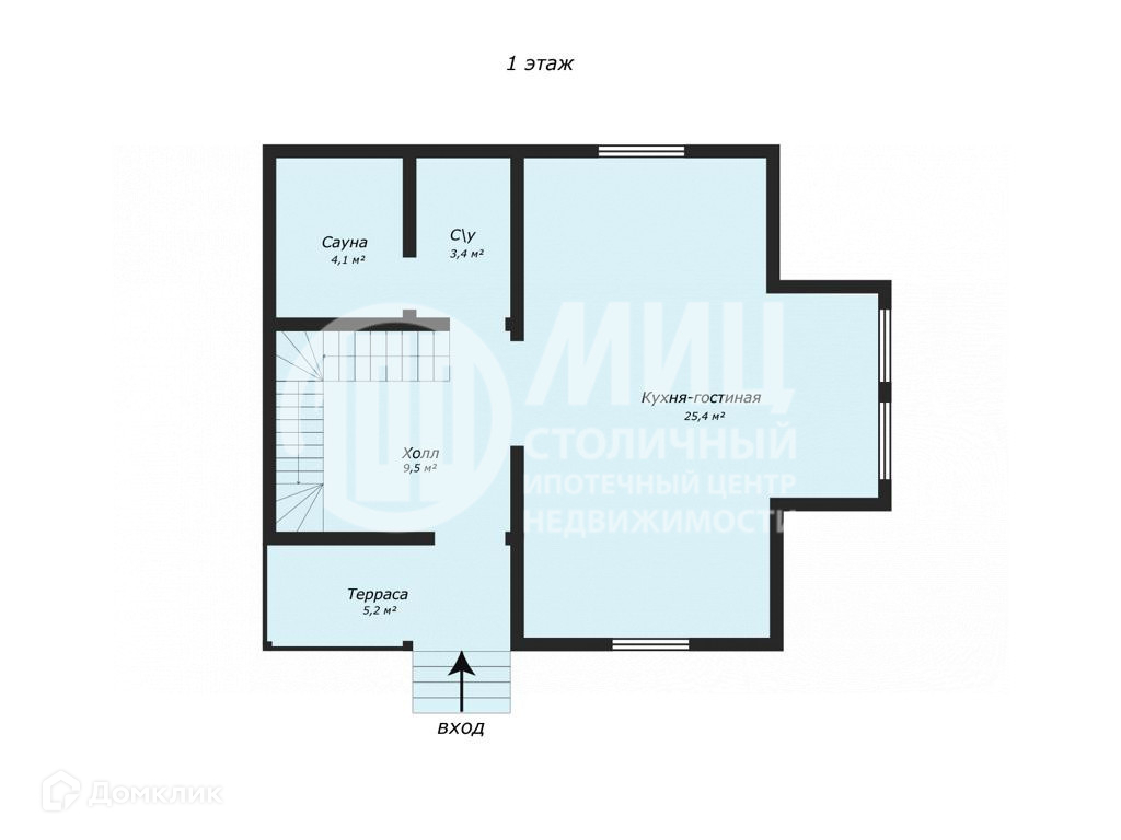 1 этаж: кухня-гостиная, ванная комната, спальня, холл, сауна