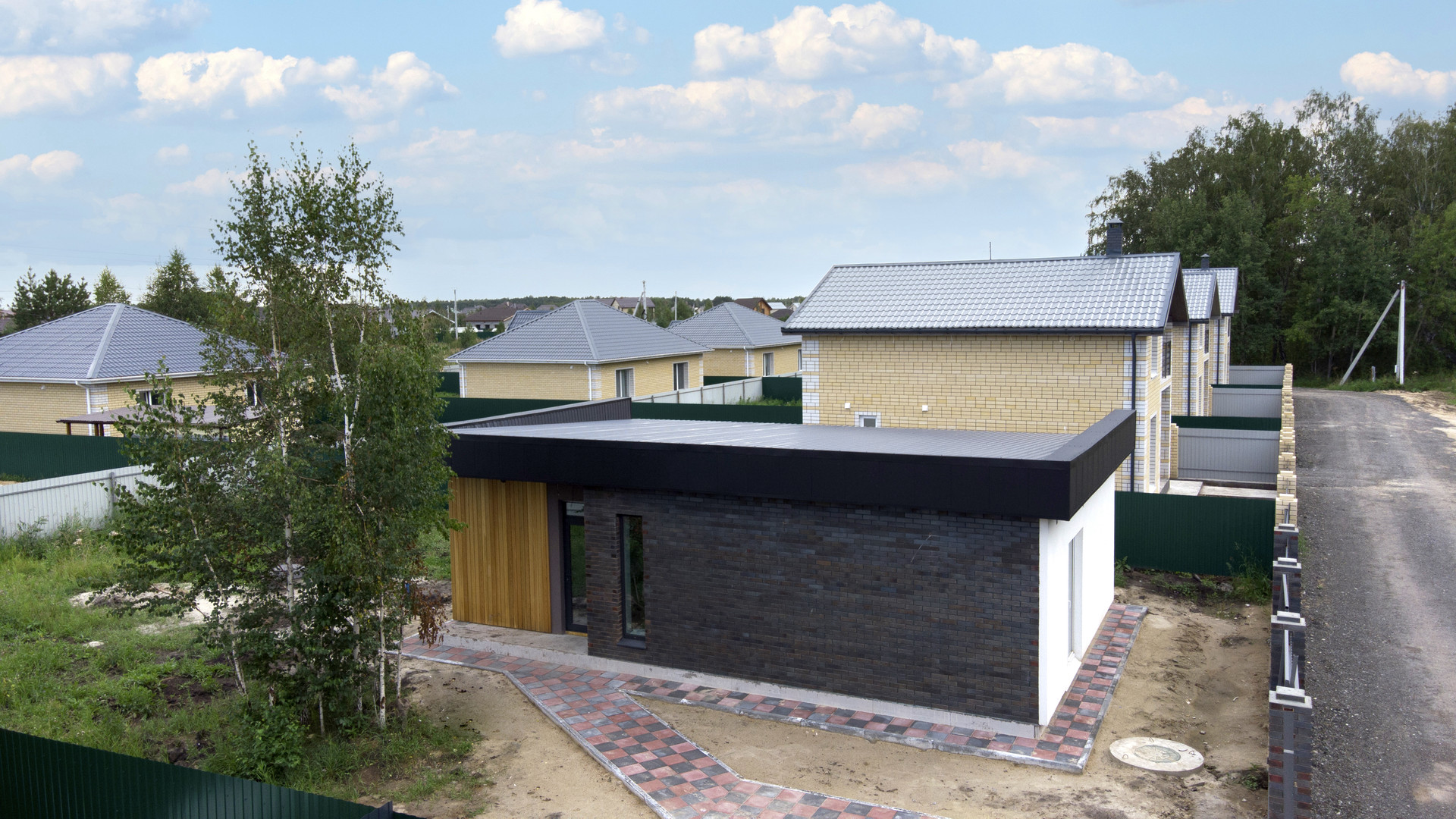 • Рядом общеобразовательная школа, детский сад, магазины, автомойка, рядом с коттеджным поселком автобусная остановка.