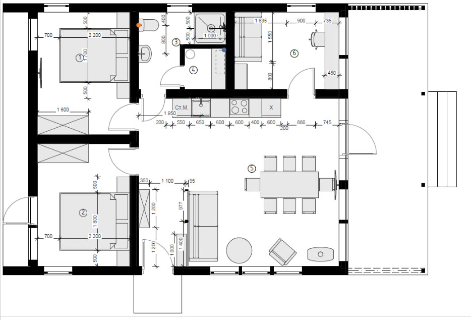 Планировка дома: кухня-гостиная, санузел, 2 спальни, кабинет, большая терраса.