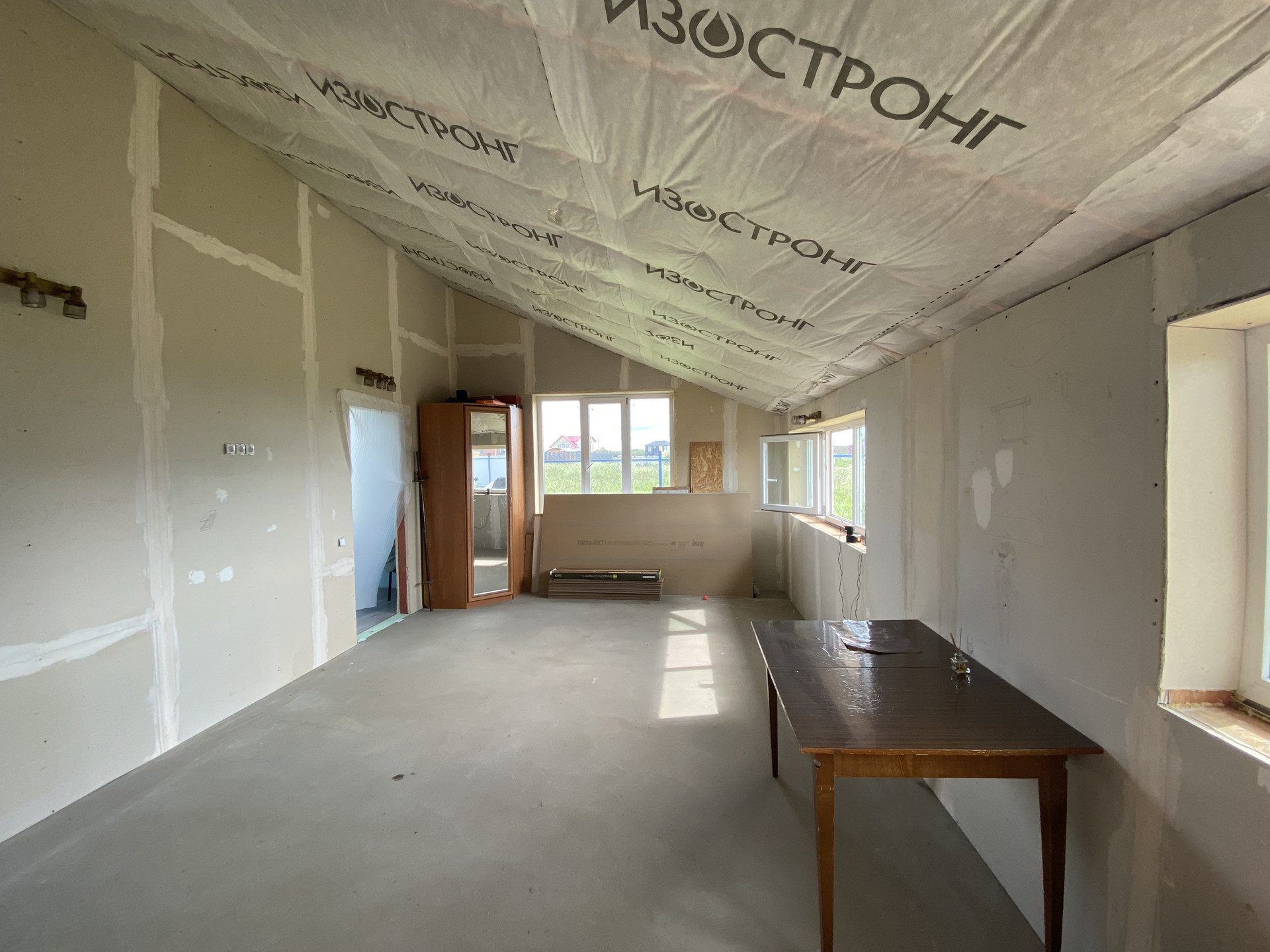 Стены и крыша утеплены минеральной ватой 150 мм, внешняя обшивка выполнена из плит OSB 12, покрытые грунт-краской Holzer, крыша покрытка металлочерепицей с дополнительным слоем оцинковки. Окна - стеклопакеты с наполнением по сторонам света. Внутренняя отделка: предчистовая, двойной слой ГКЛ.