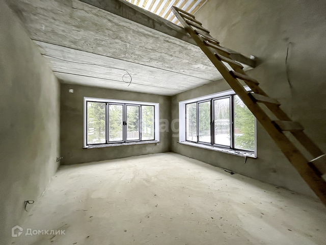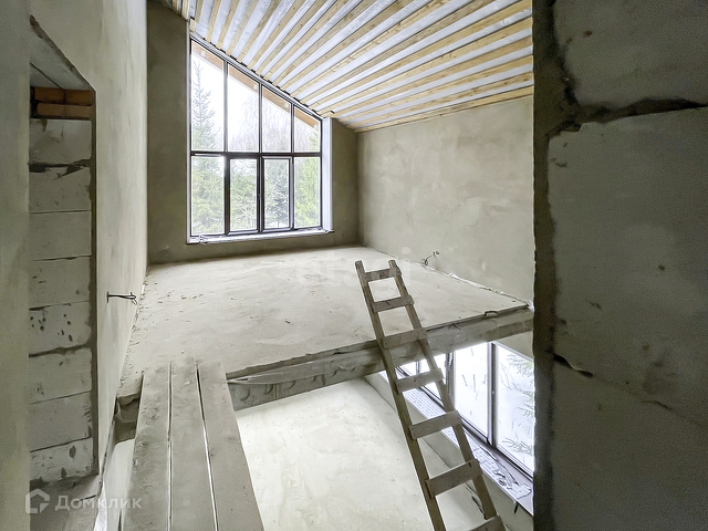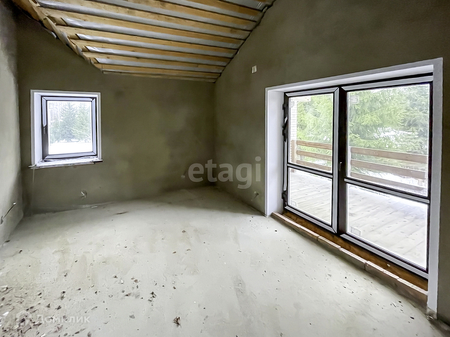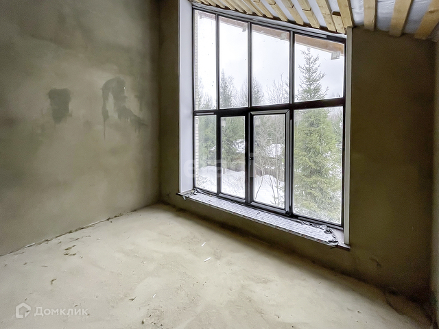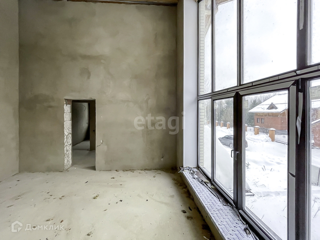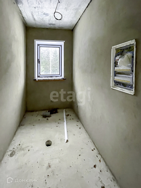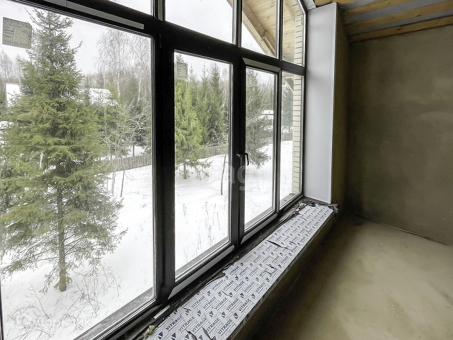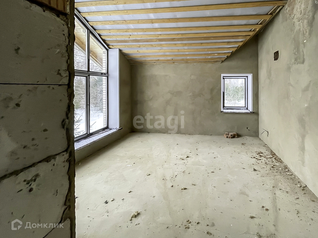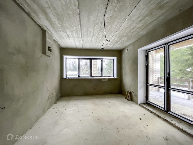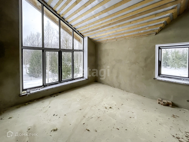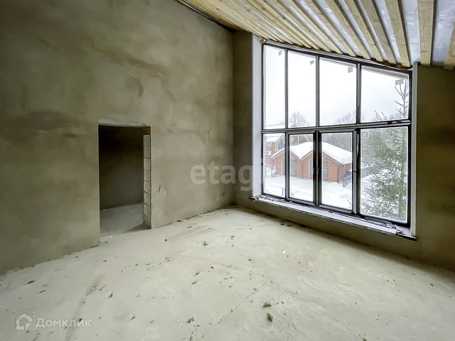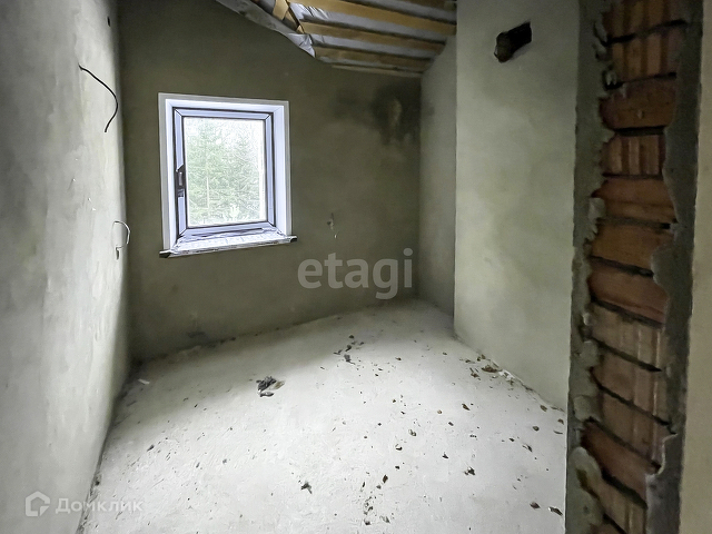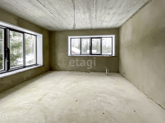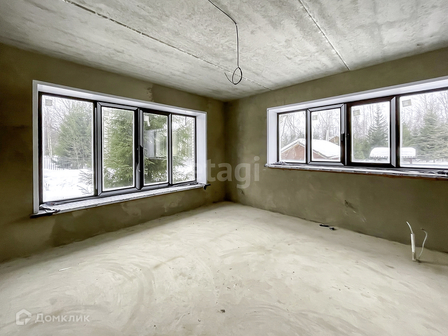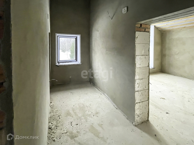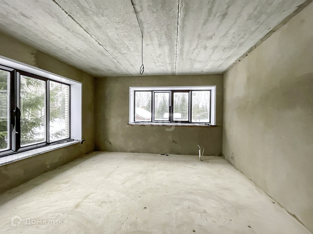 Выполнена предчистовая отделка. На полу бетонная стяжка, стены оштукатурены, электричество заведено в дом, сделана разводка.