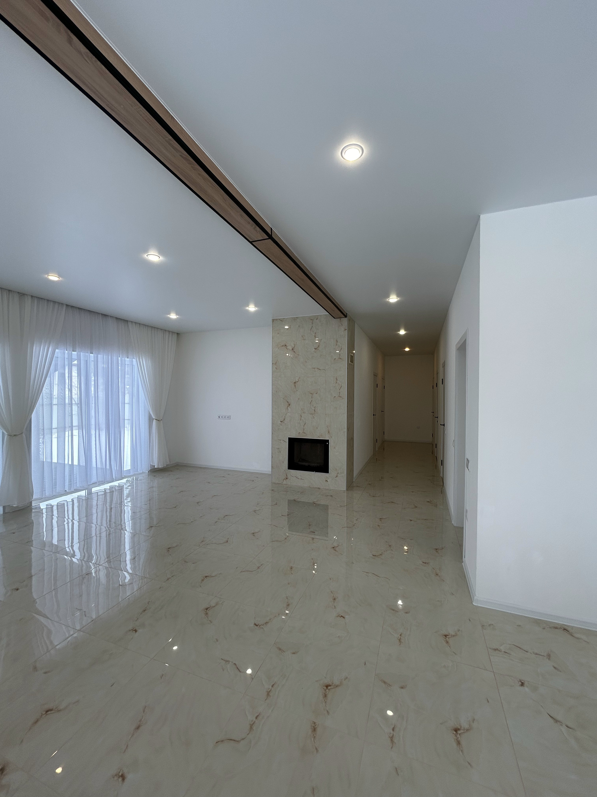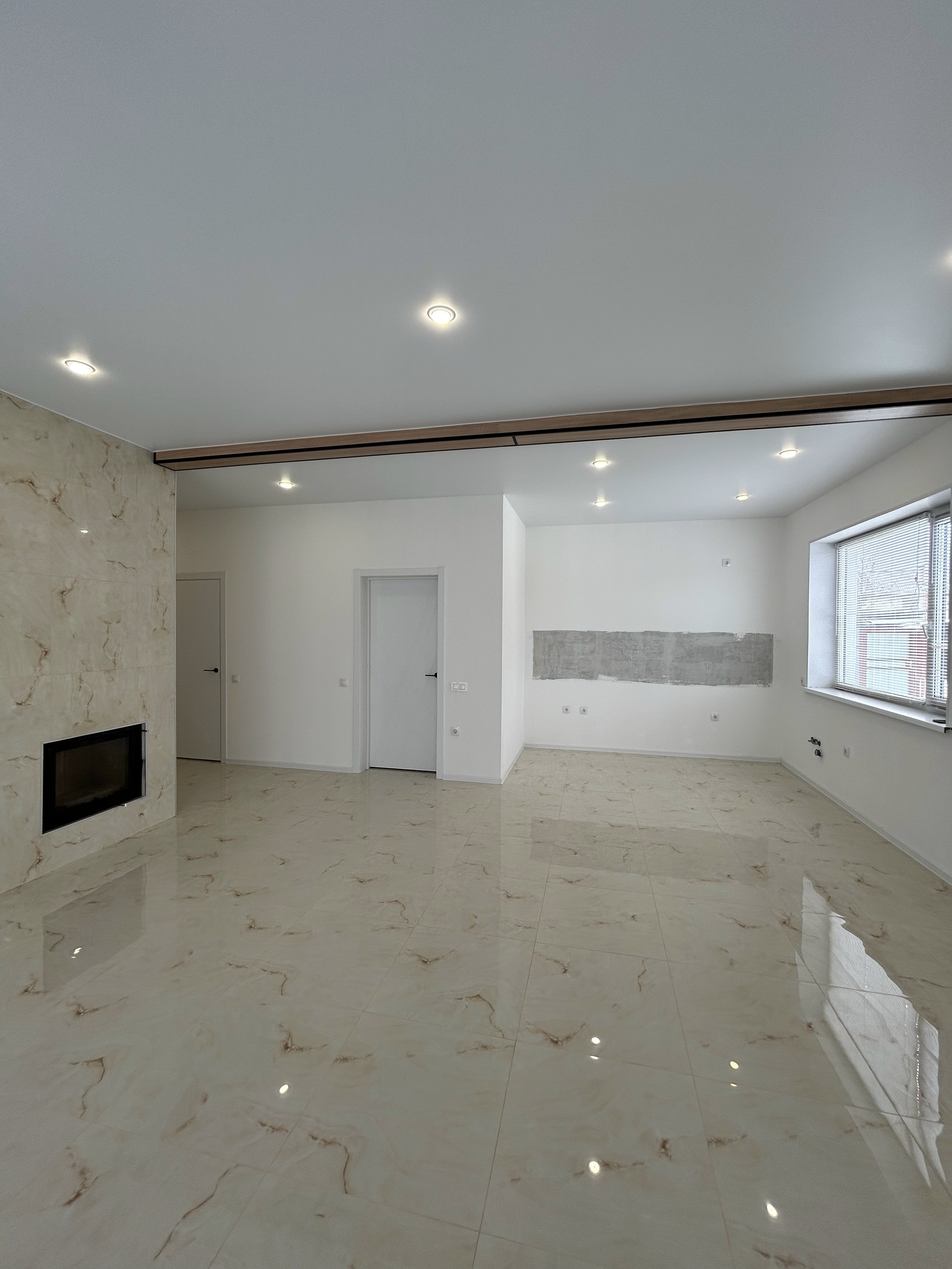просторная кухня-гостиная с камином и выходом на крытую террасу.,