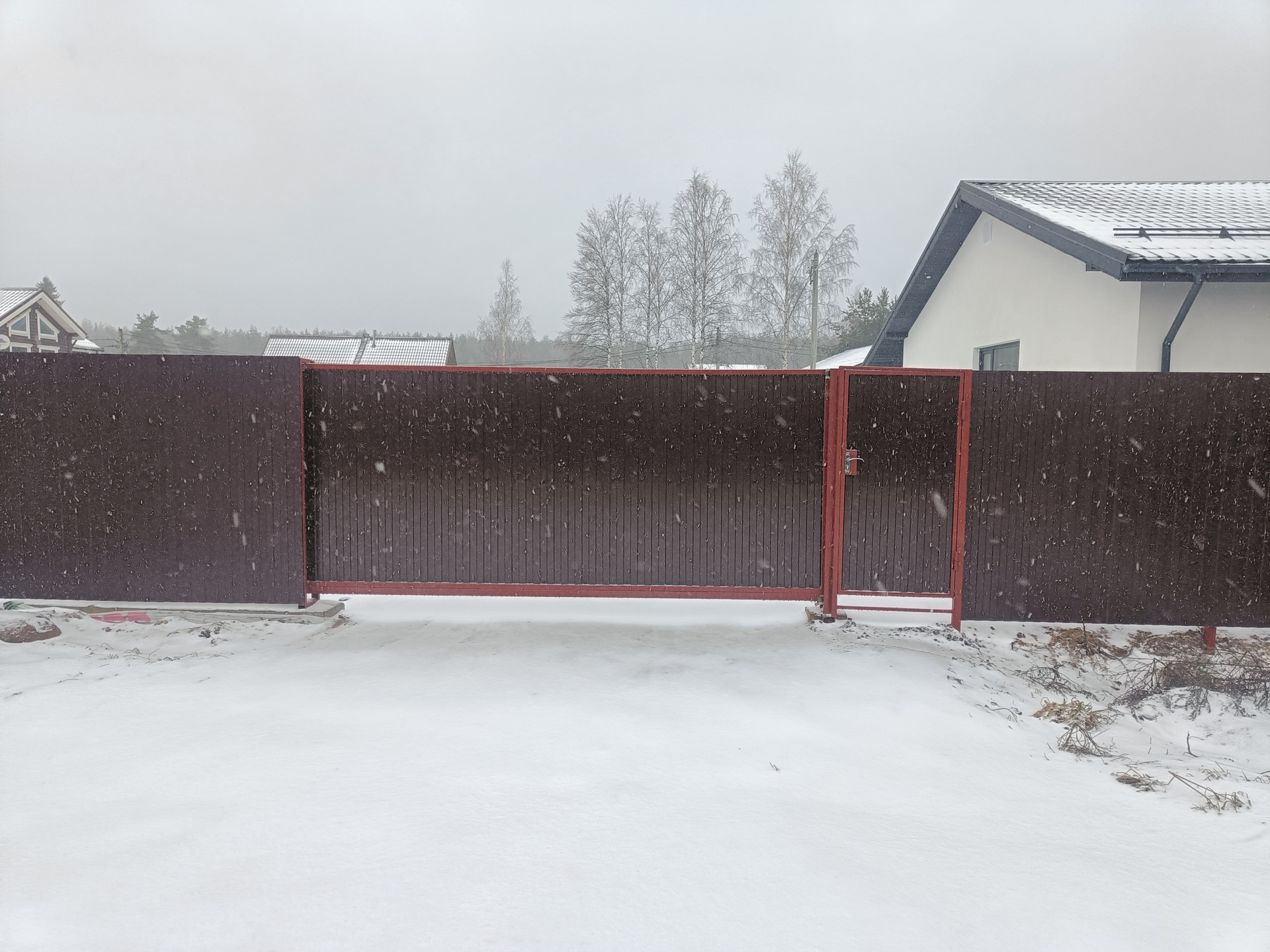 ограждение по всему периметру, откатные ворота с электроприводом.