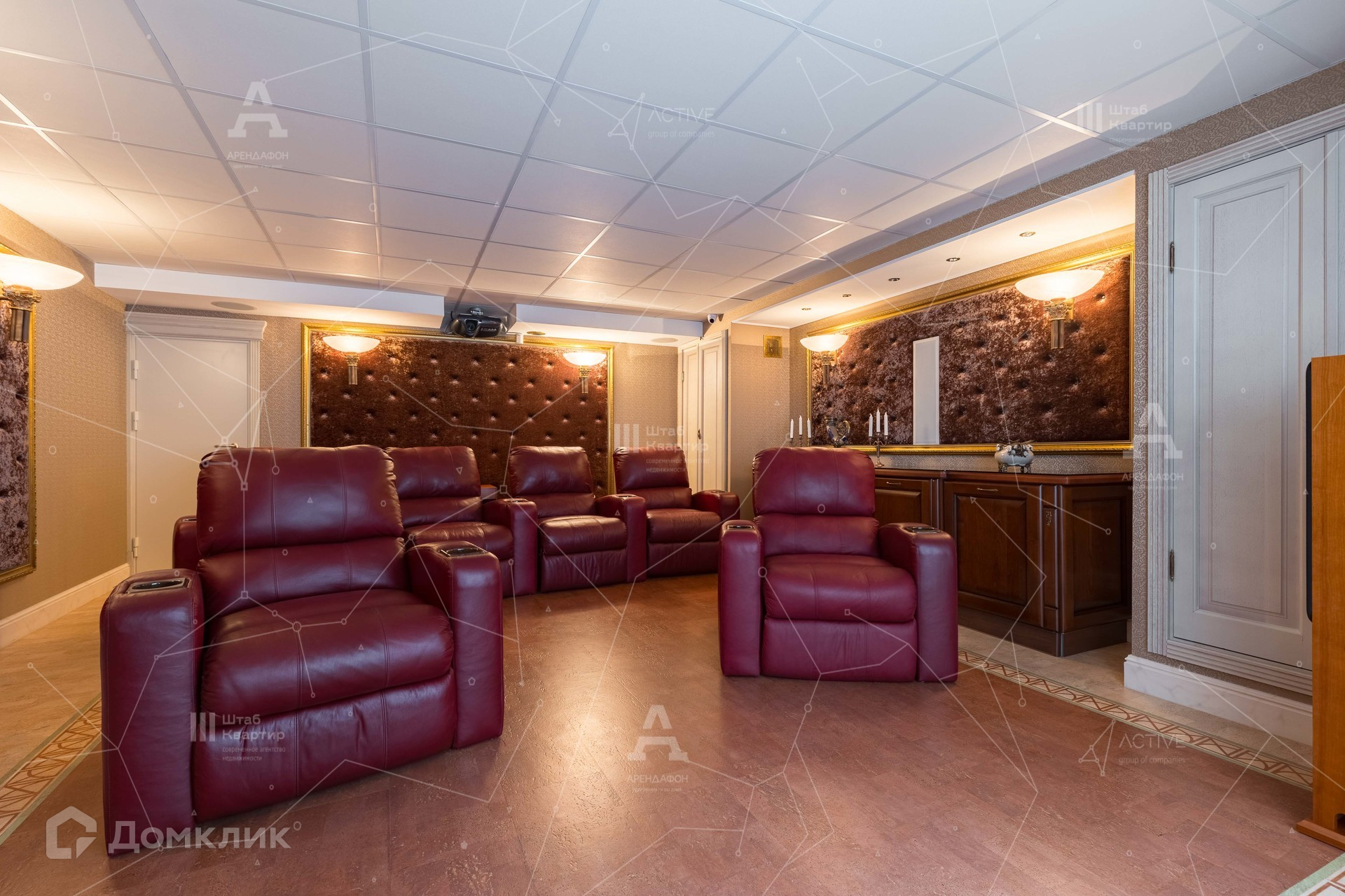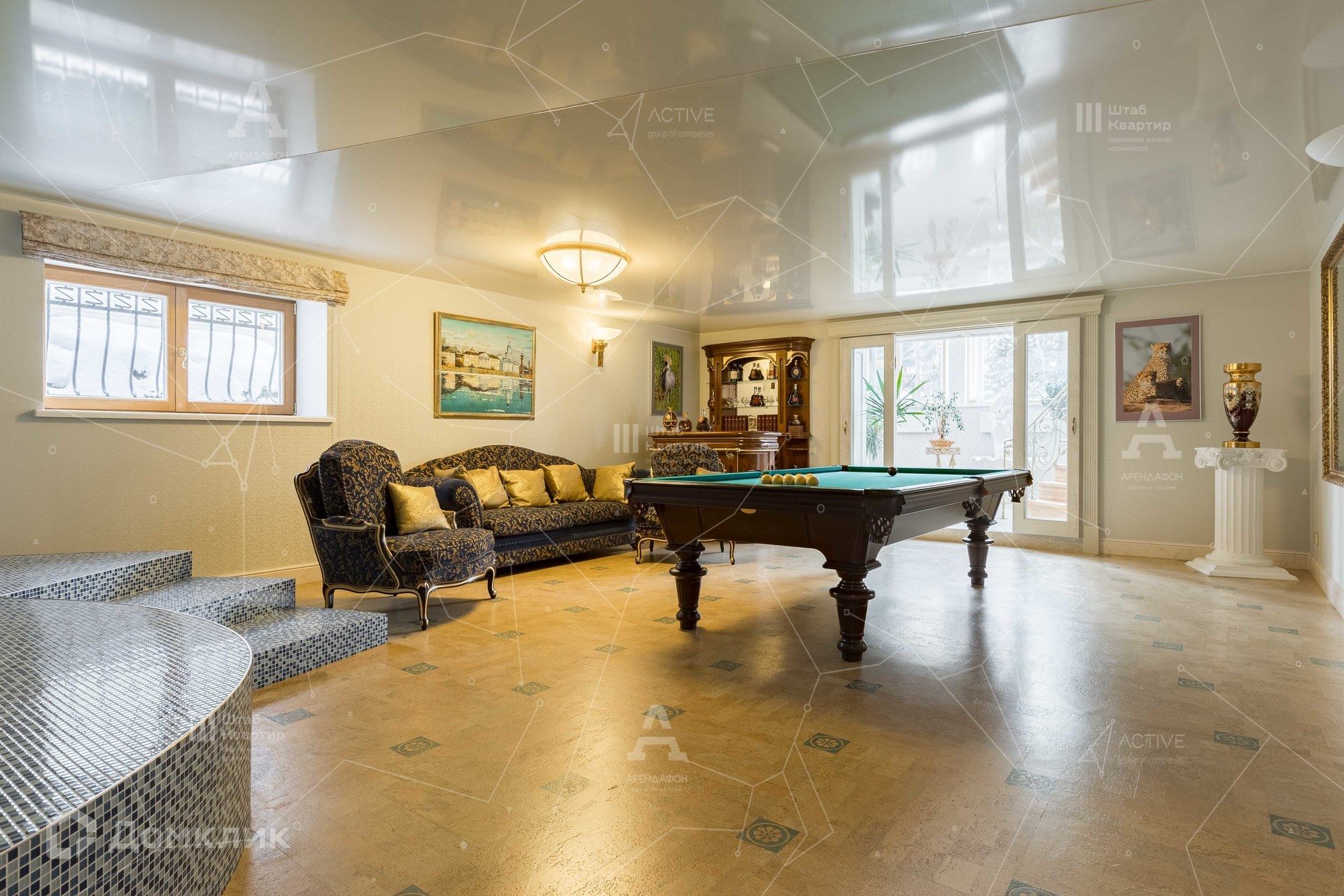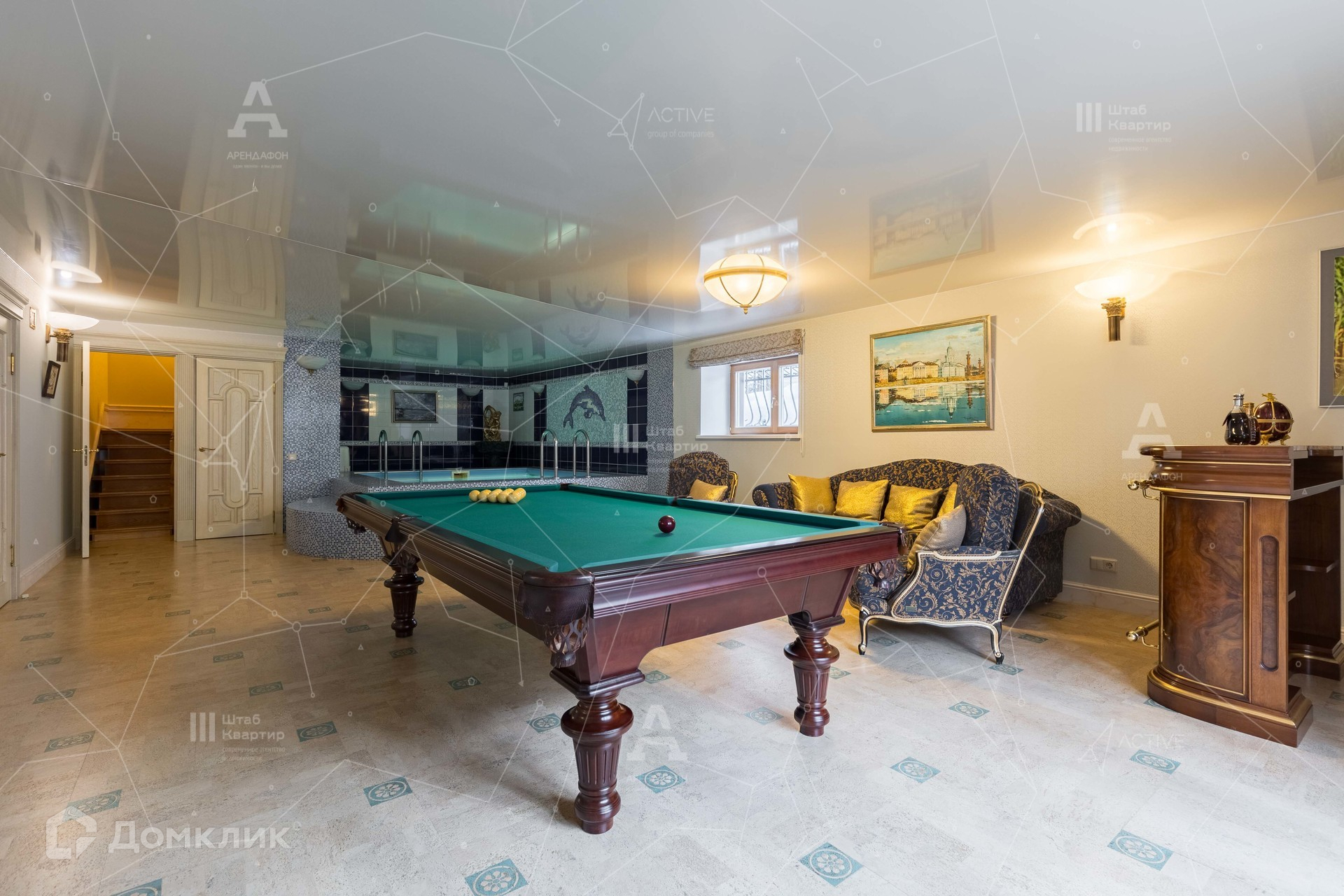 Цокольный этаж - бильярдная и минибаром, сауна с бассейном и душевой, профессиональный кинозал, котельная, гараж с генератором.