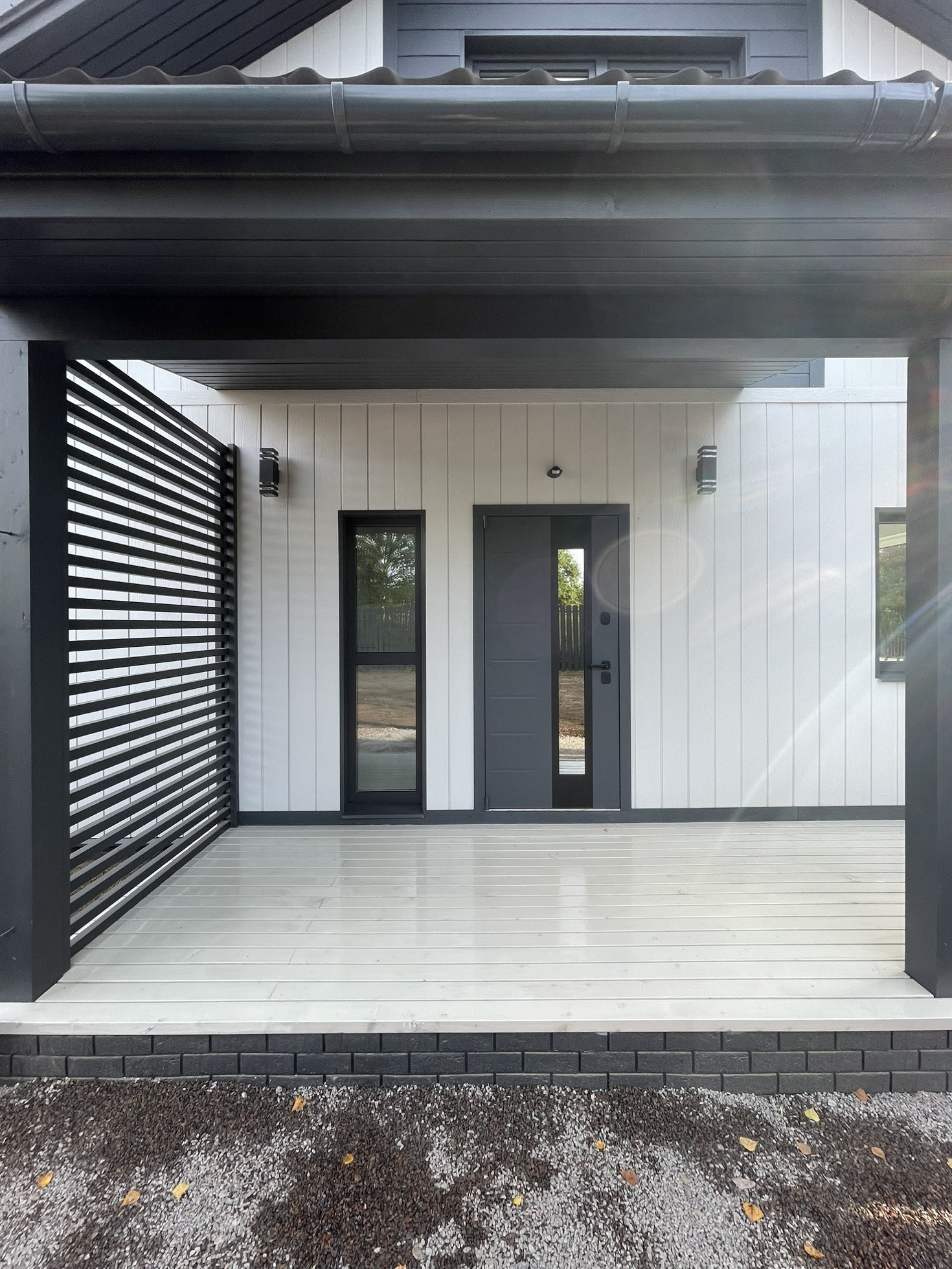 УЧАСТОК С ЗАБОРОМ, ГАЗОНОМ. Участок полностью огорожен забором из металлического штакетника в цвет кровли.