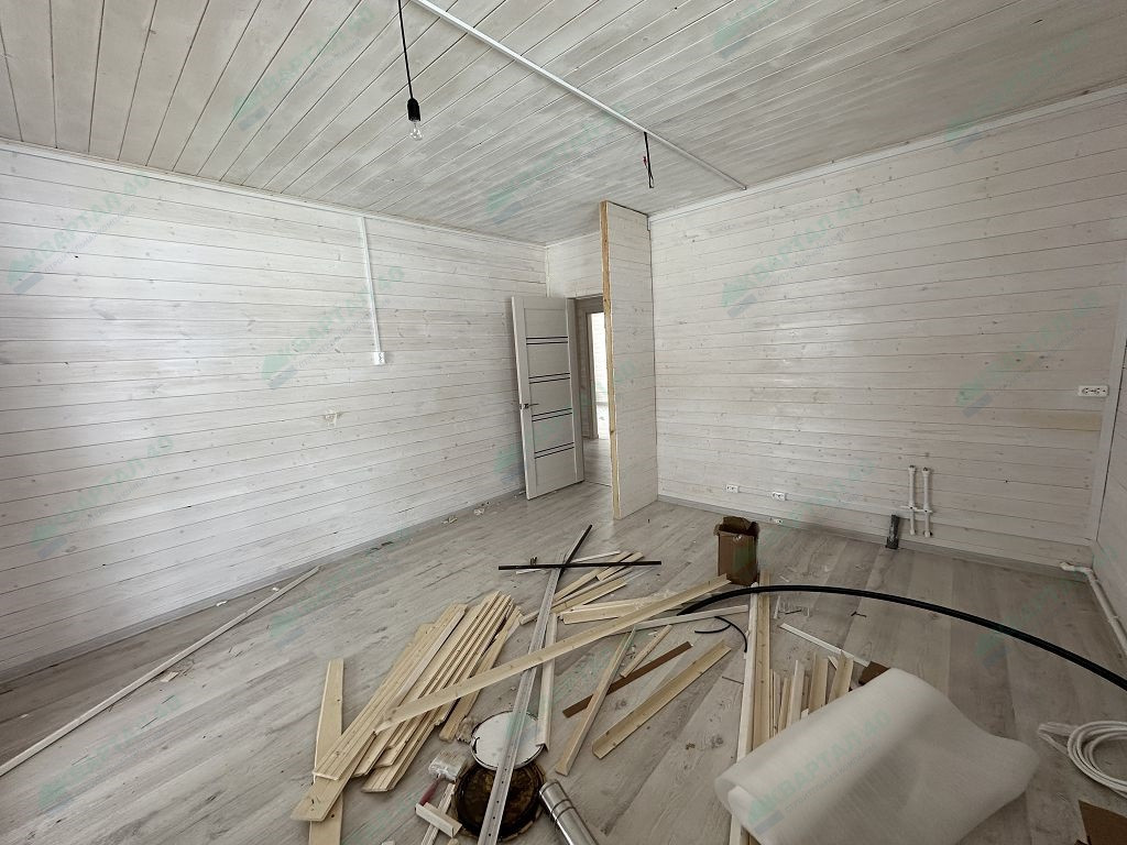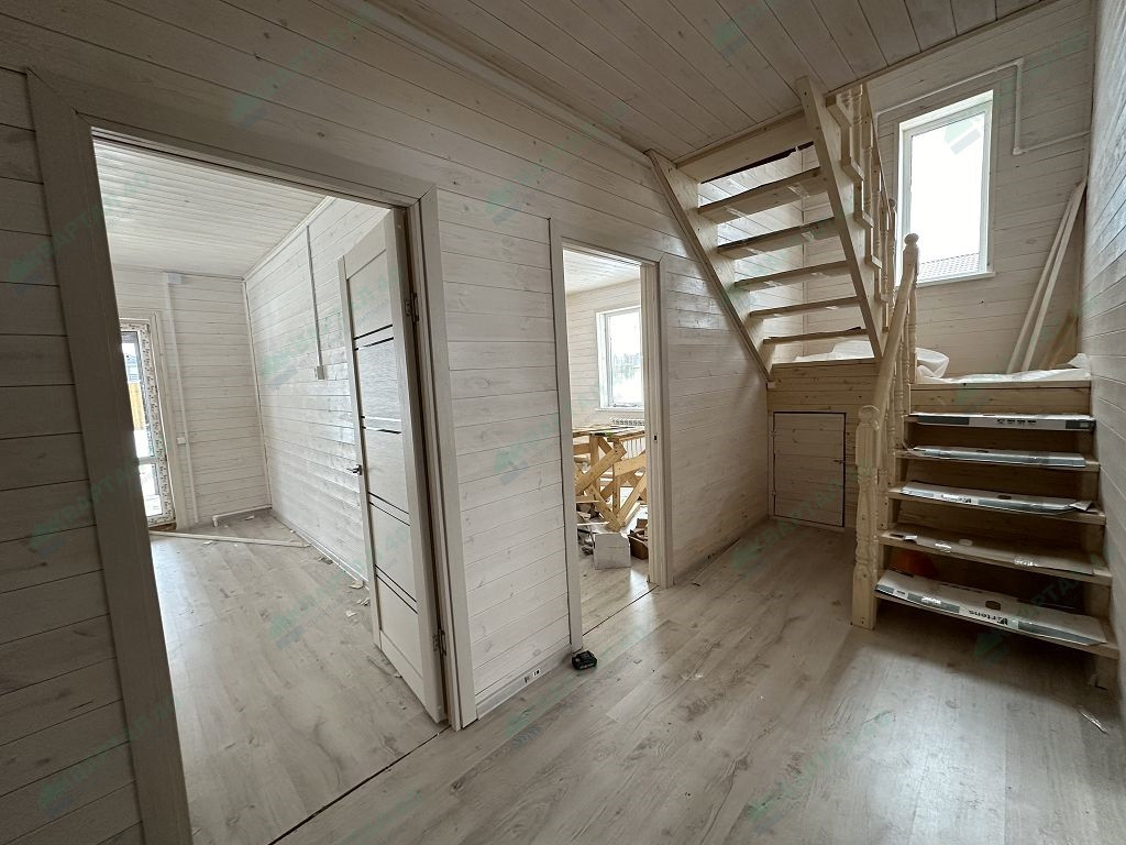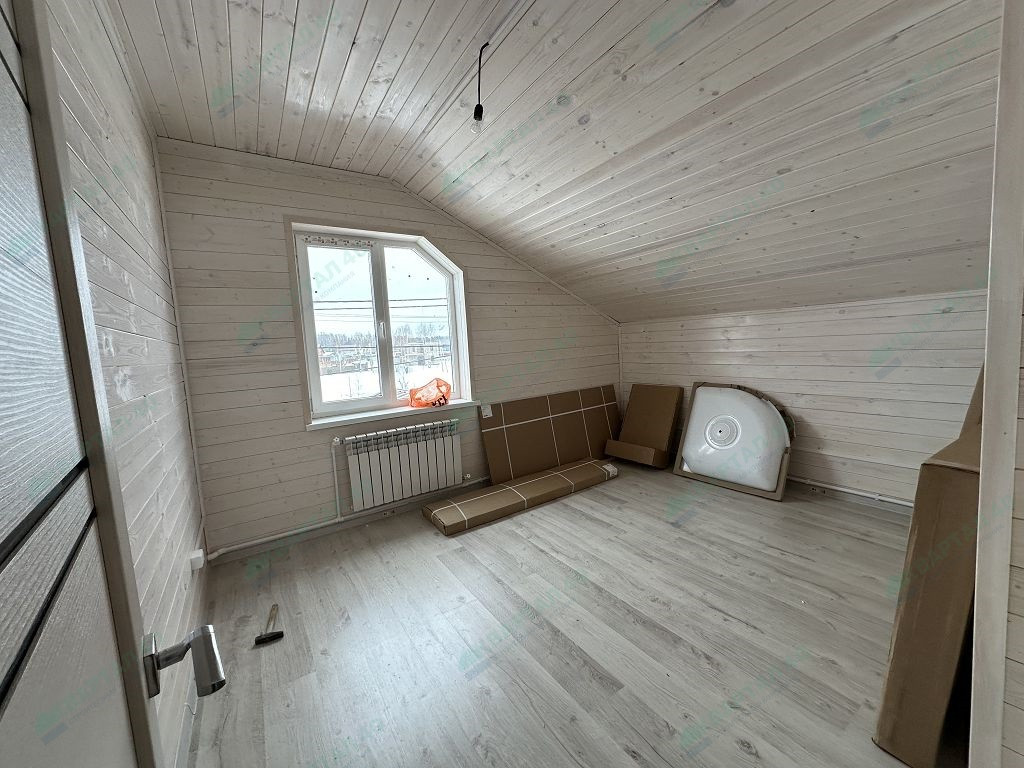 Материал стен - брус 150 мм. и наружное утепление 100 мм., пол и крыша утеплены - 150 мм, отделка наружная и внутренняя - имитация бруса (внутри и снаружи обработан, покрашен);