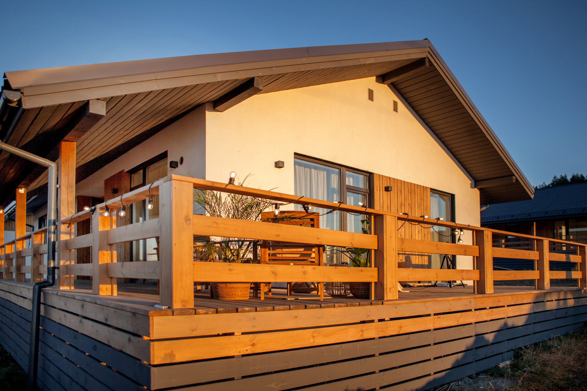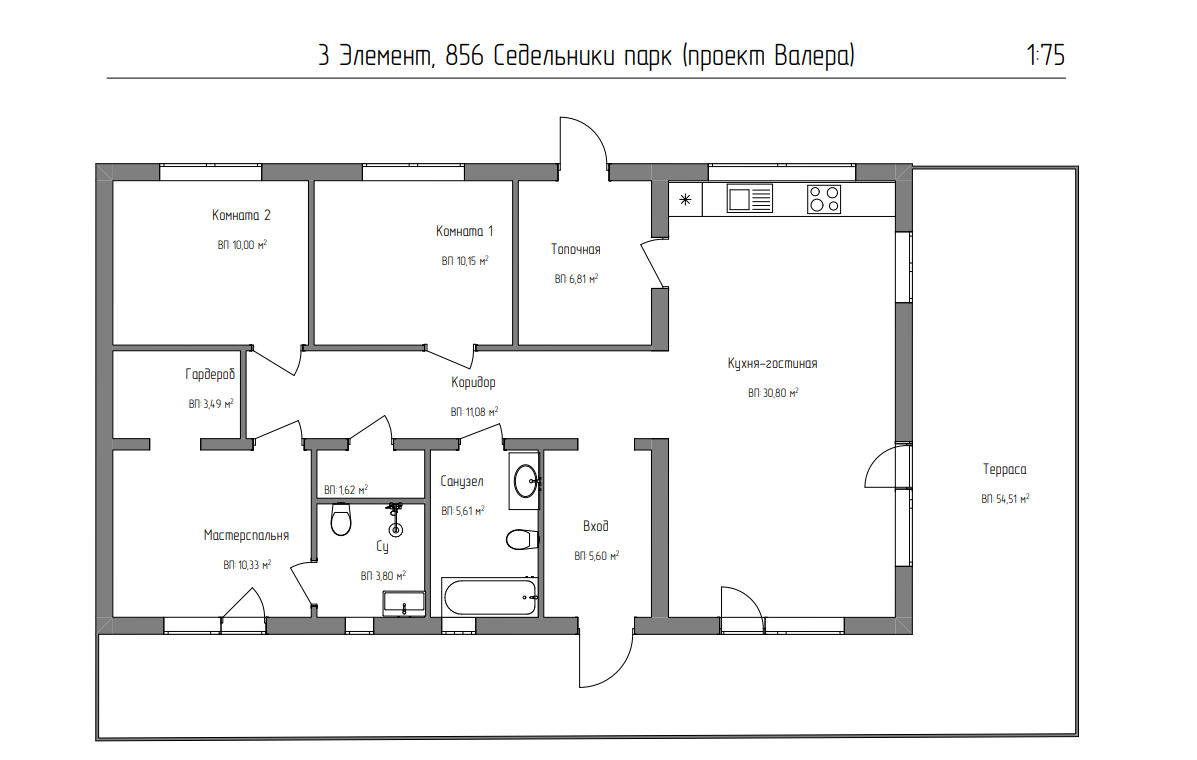 В доме: кухня-гостиная,  мастер-спальня с гардеробом и санузлом, 2 комнаты, отдельный санузел, топочная.