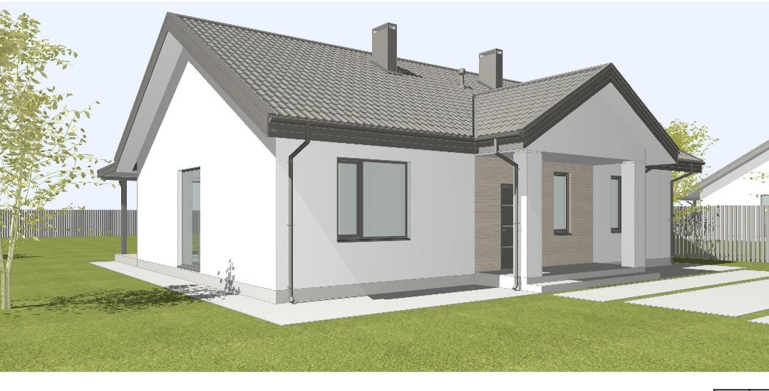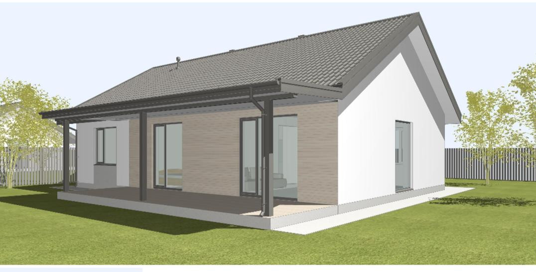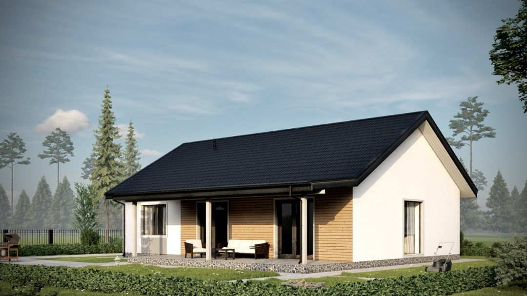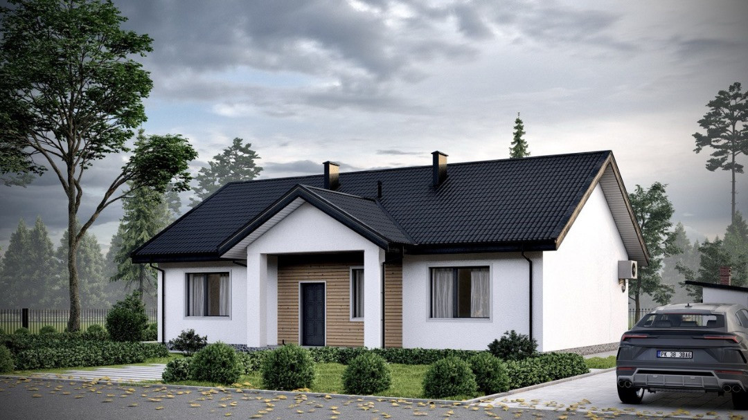 Фасад из долговечных материалов - комбинированный фасад, декоративная штукатурка и деревянные вставки - гармонично сочетаются.