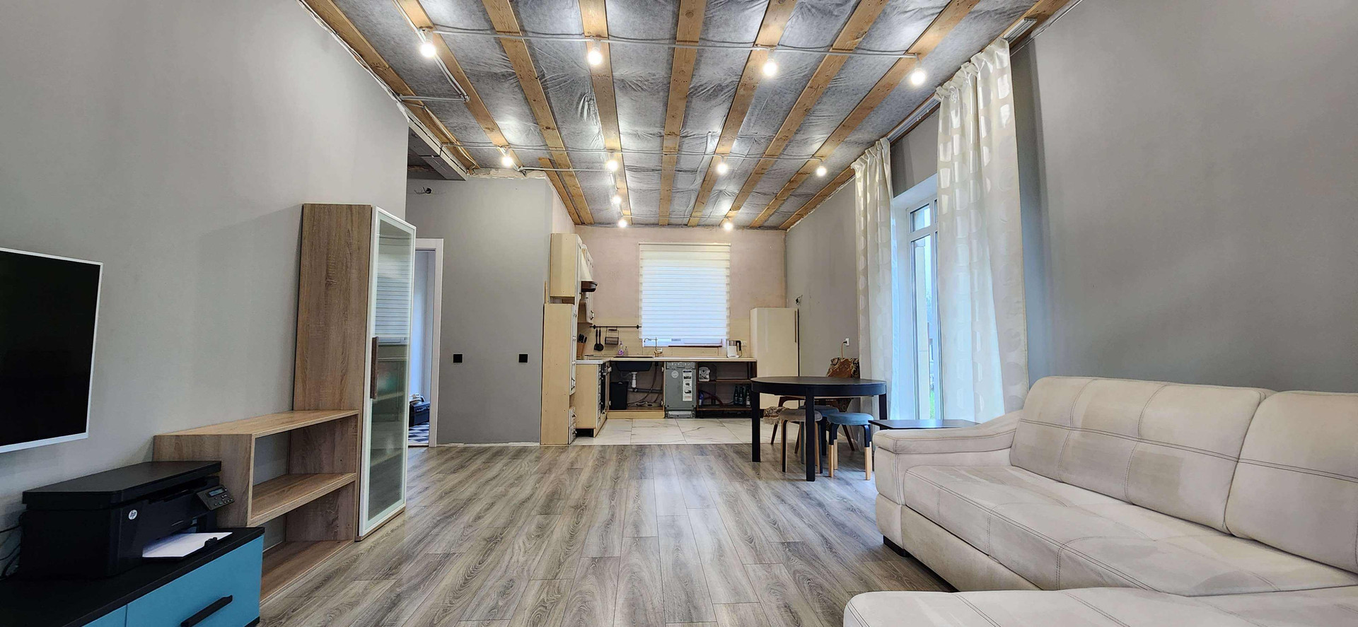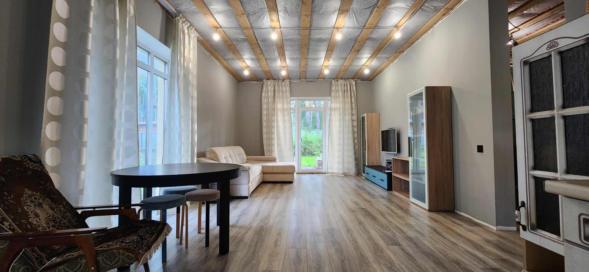 +просторная кухня-гостинная, с панорамными окнами и выходом во двор