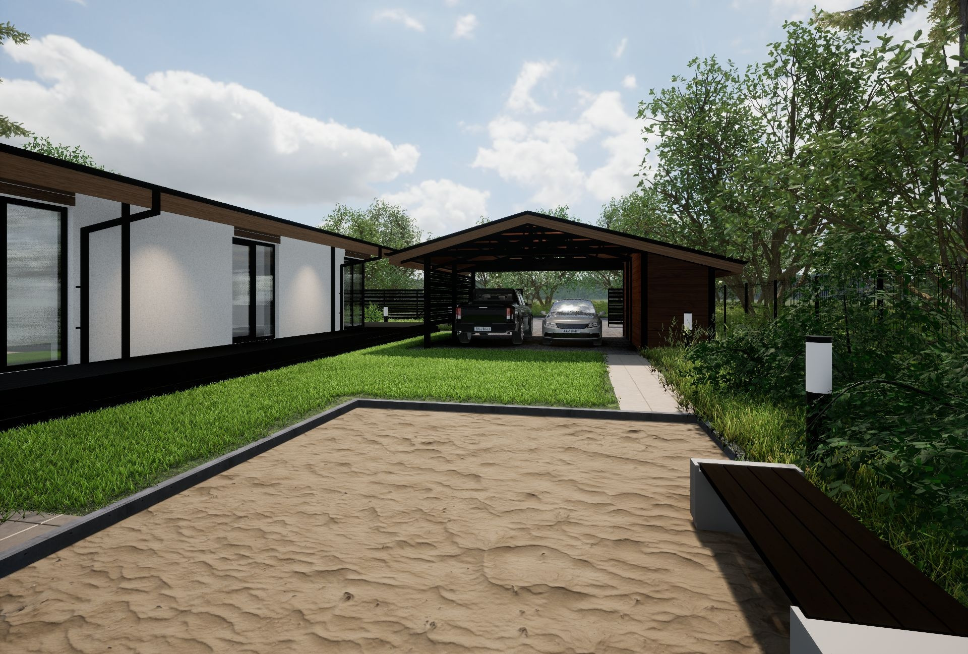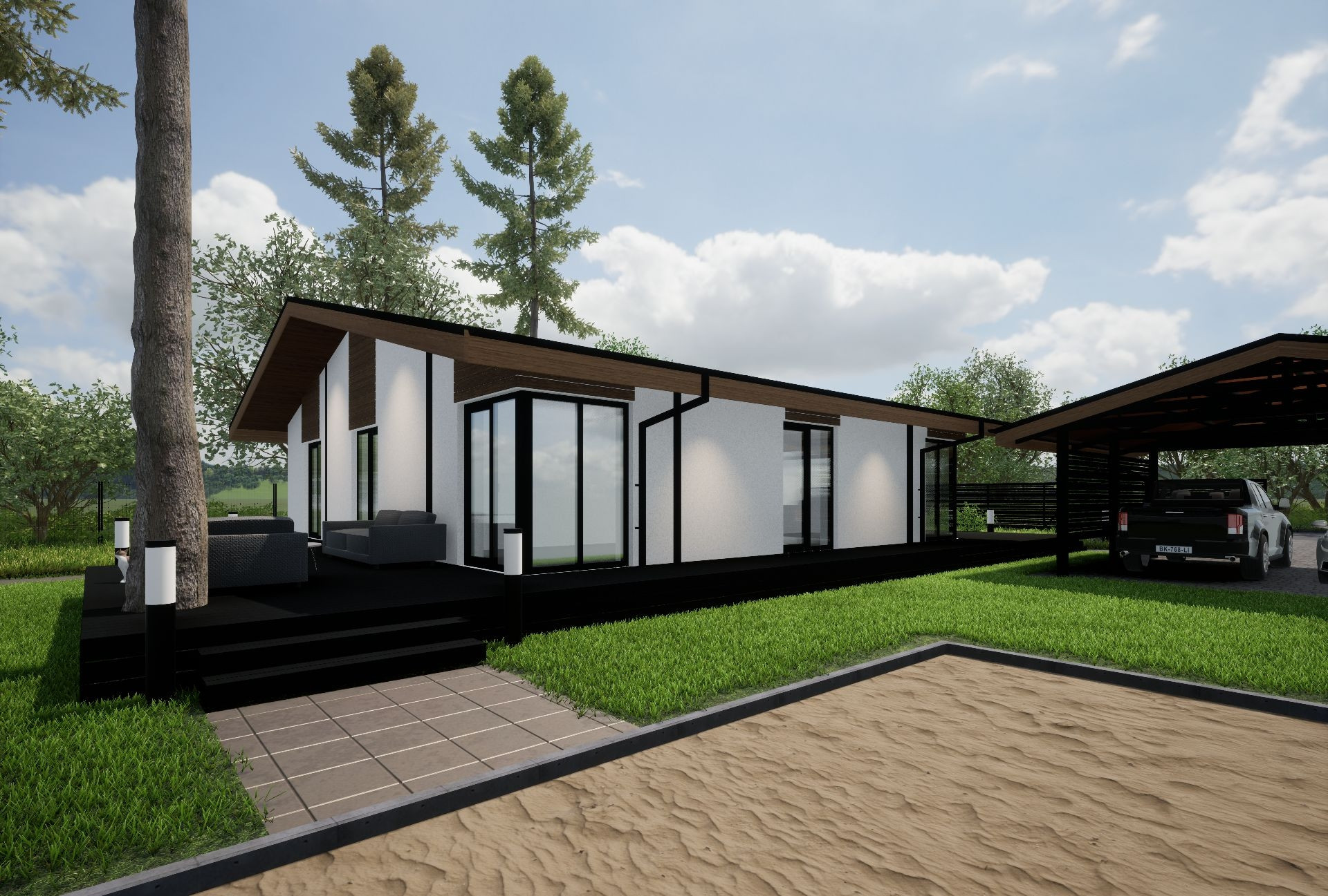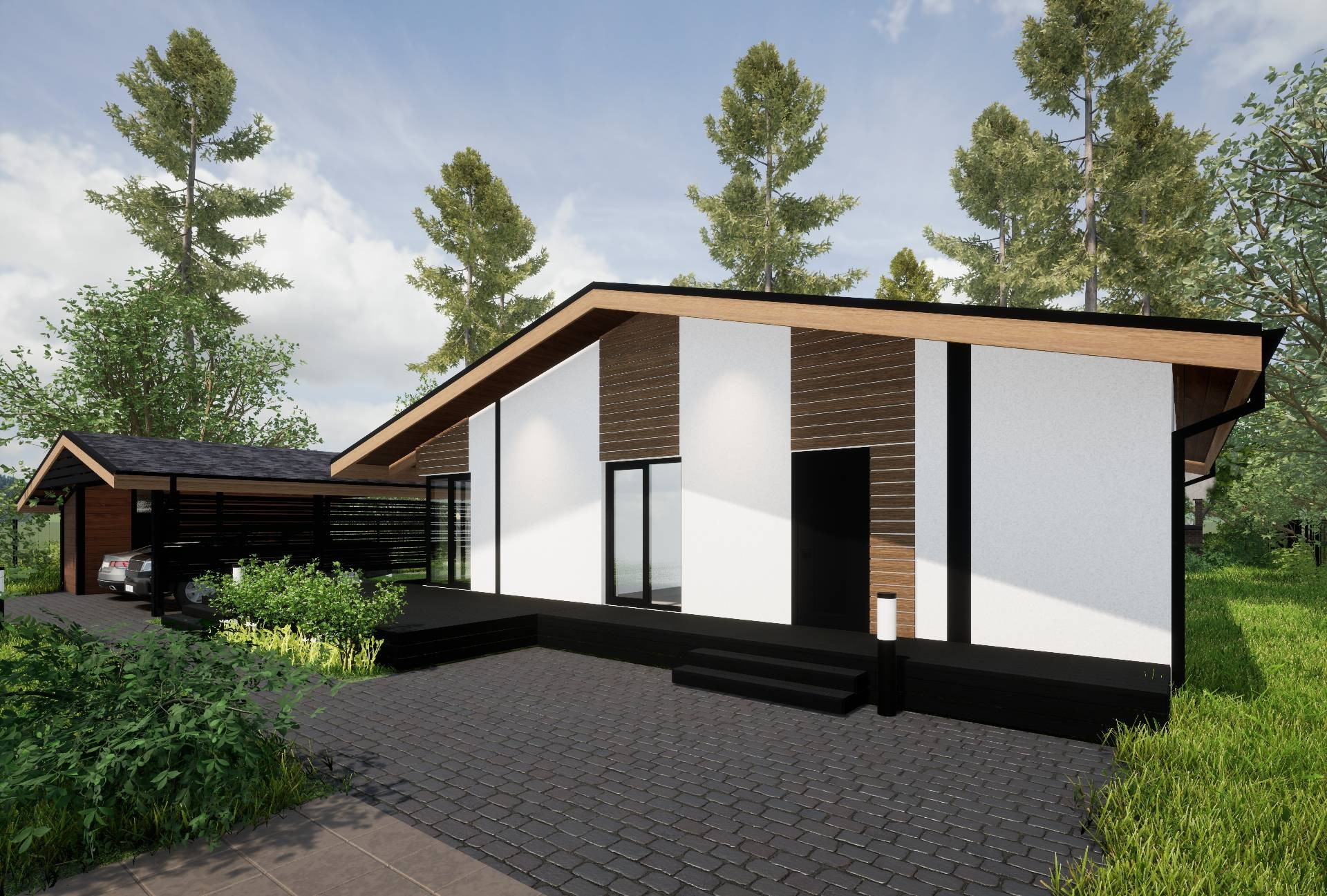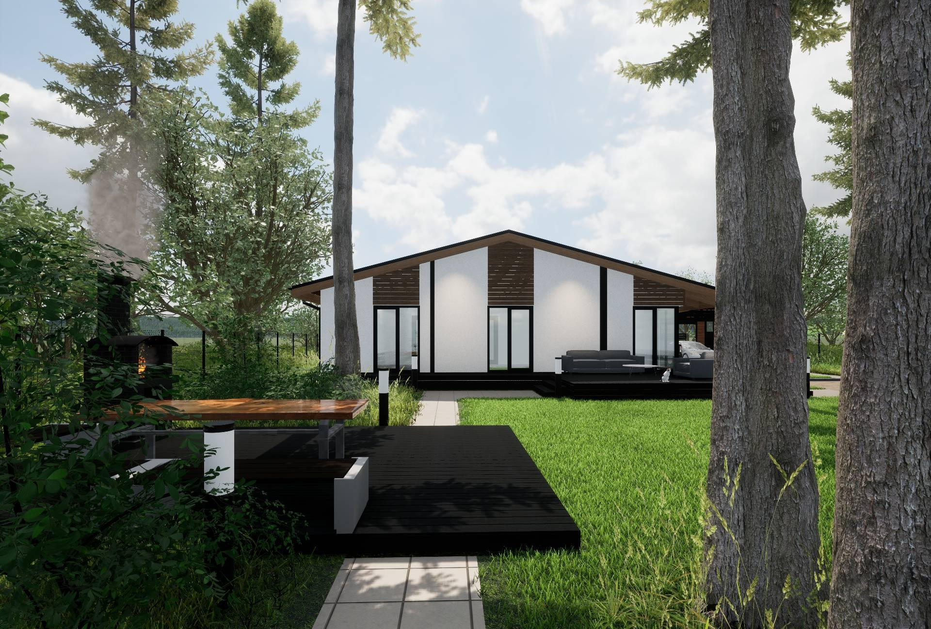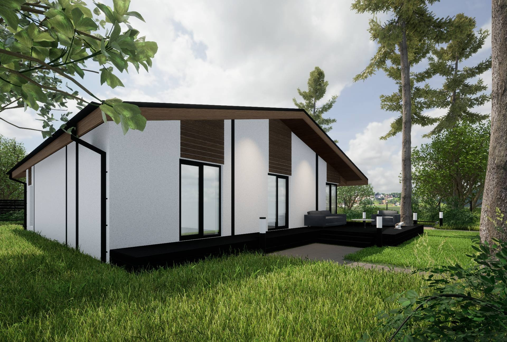 По проекту дома в нем панорамные окна, широкие веранды, очень уютная планировка, сторится для молодой семьи с детьми, чтоб было много пространства и места для работы и отдыха, внутри нет перекрытий, пространство под кровлю, высокие потолки в коньке.