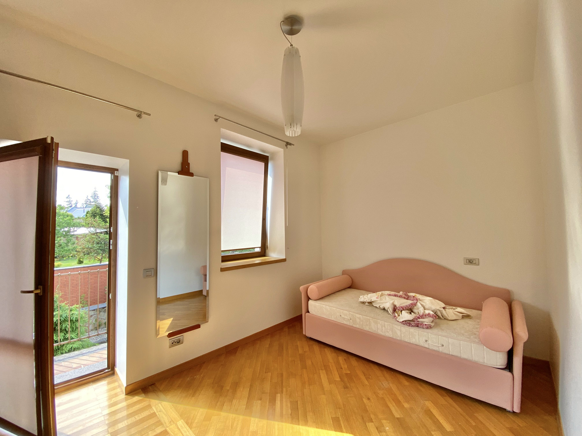 В доме: гостиная-столовая с камином и выходом на террасу, кухня, 5 спален, 4 санузла, сауна, просторная игровая на мансарде, кабинет, гараж на 1 машину.