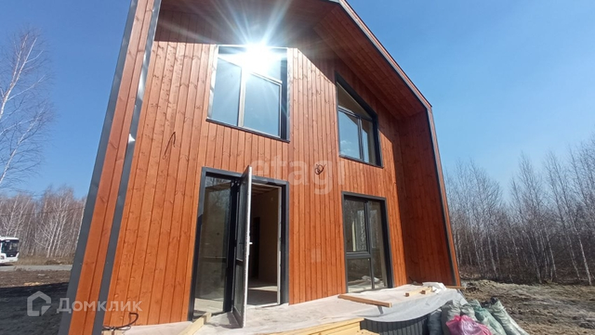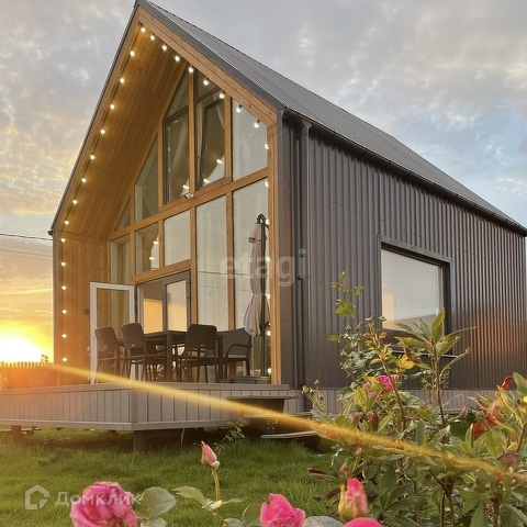 Дом построен по каркасной технологии в стиле барнхаус. Обшит металлосайдингом. Крыша коричневая металлочерепица. Отопление: установлен электрокотел.
