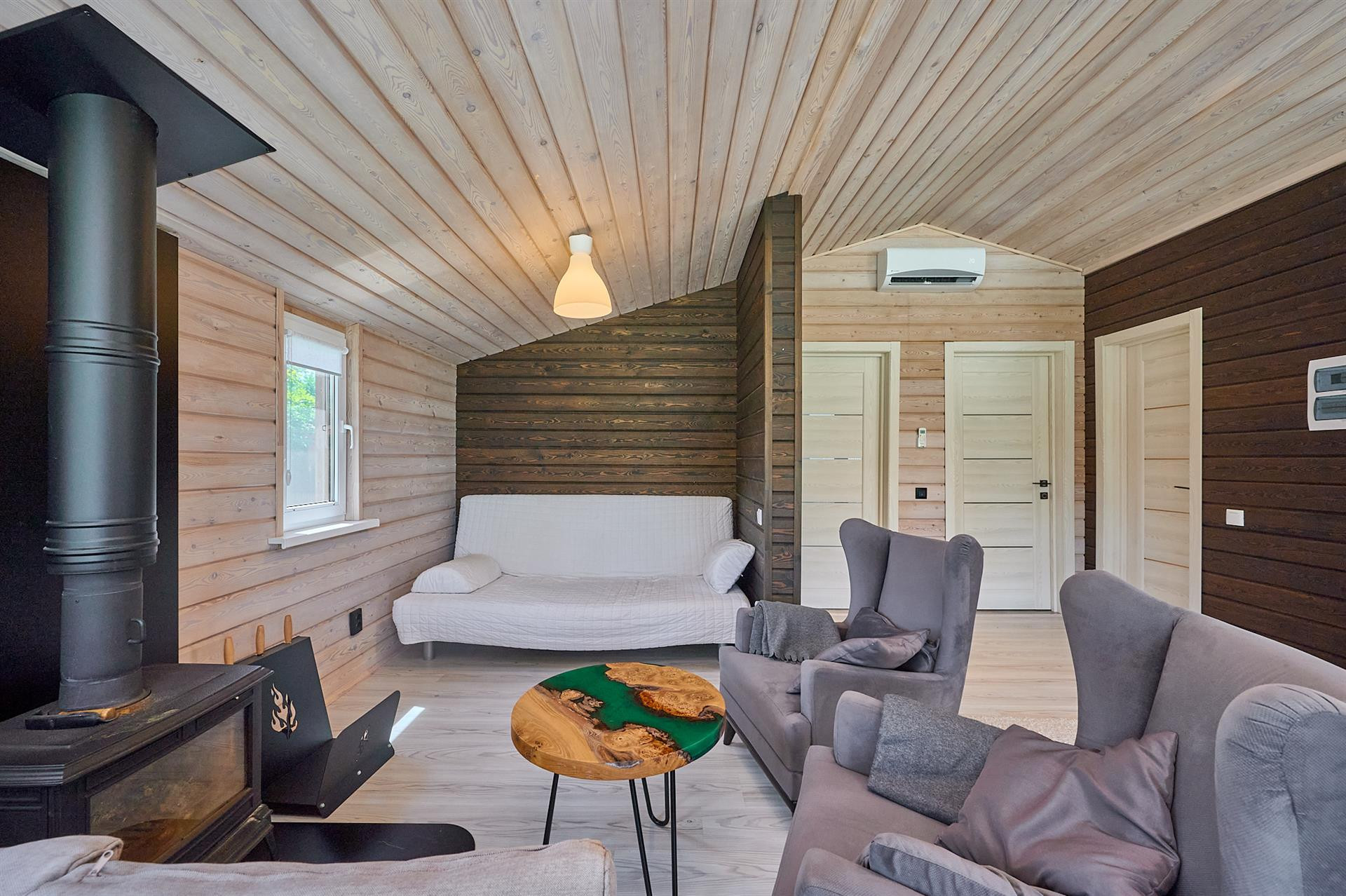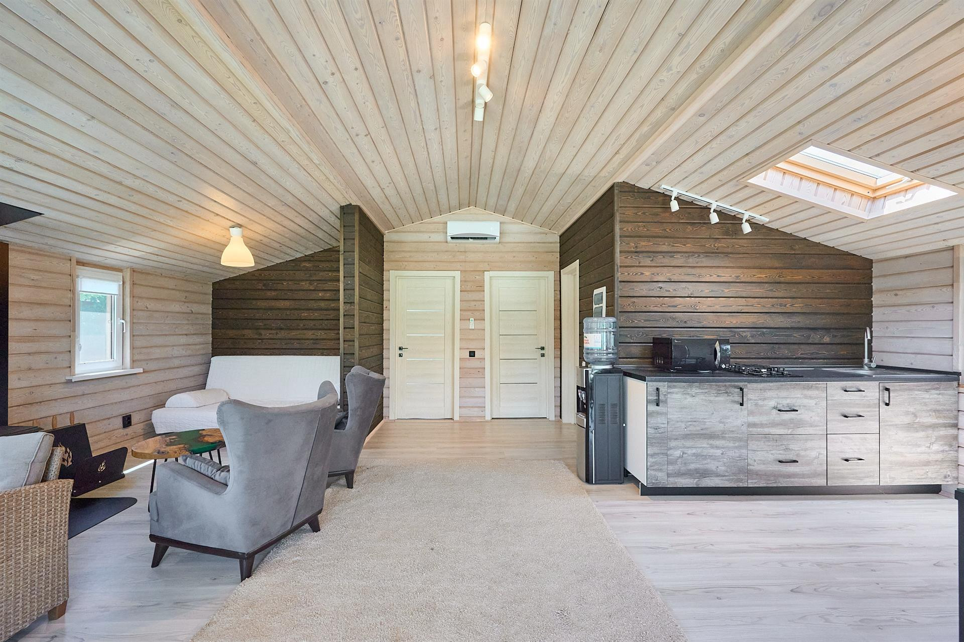 Построен из лиственницы, очень теплый, тройной стеклопакет, утепление минеральная вата 15 см rockwool, отопление электро (умный дом), сплит-система, камин.