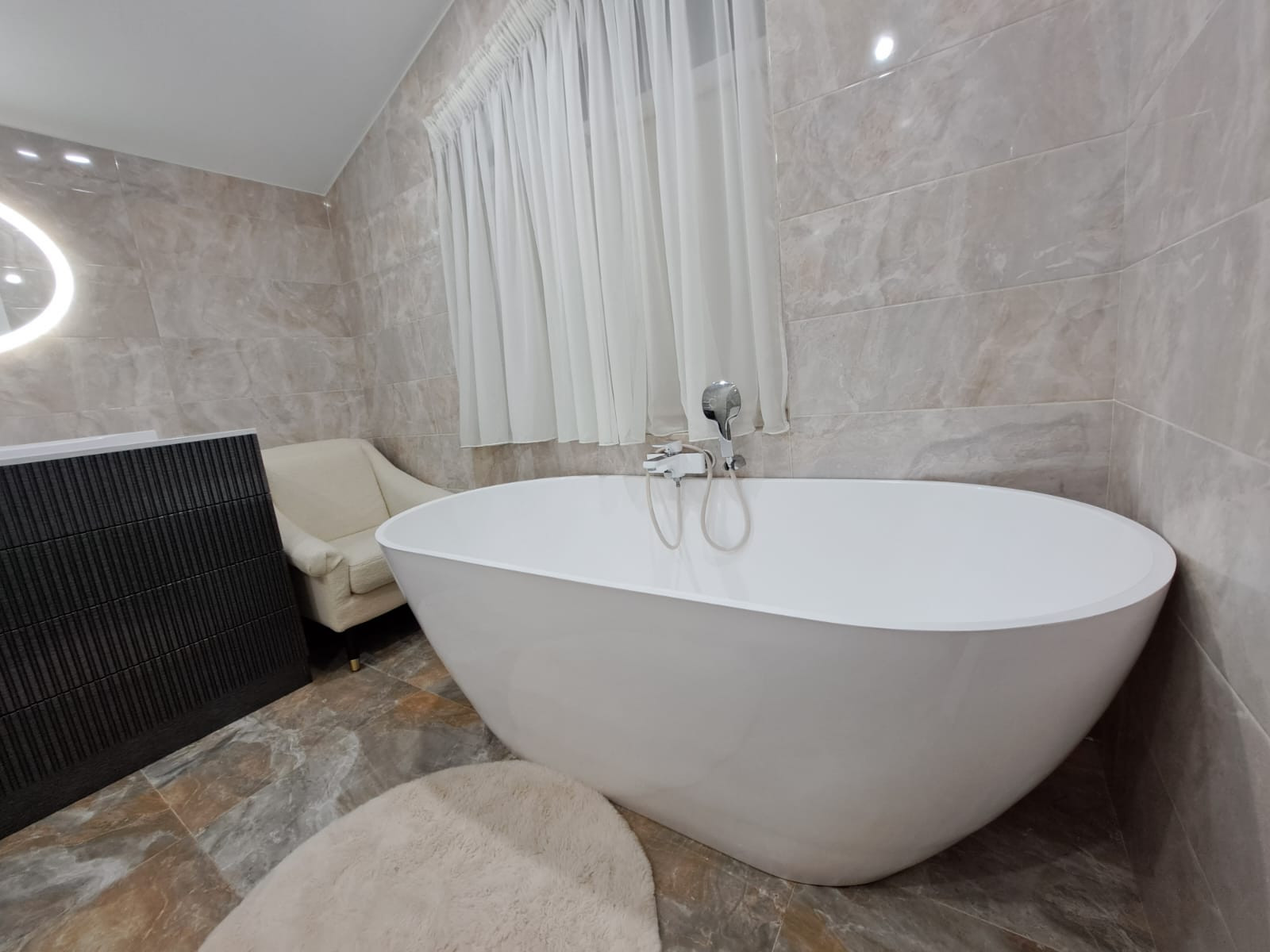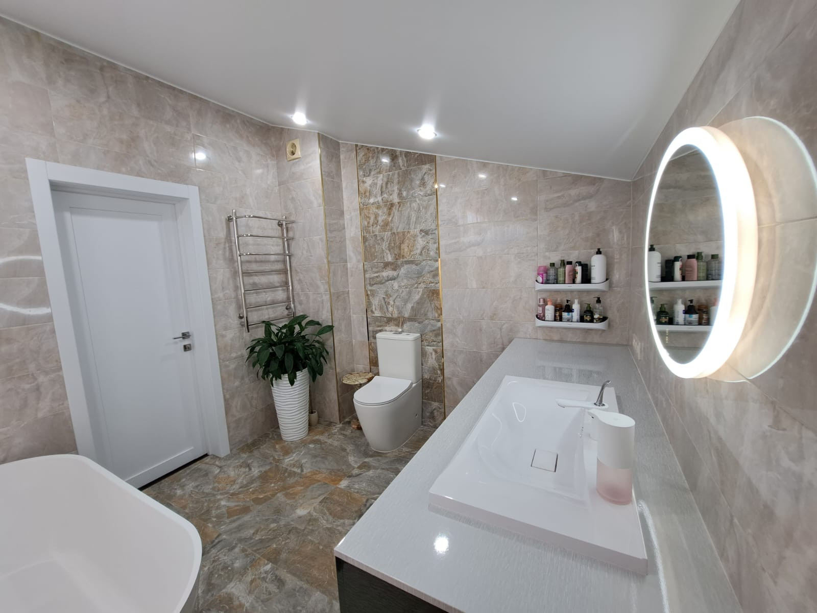 - по всему дому смонтирован водяной тёплый пол с управляющими датчиками поддерживающию заданную температуру в каждом помещении