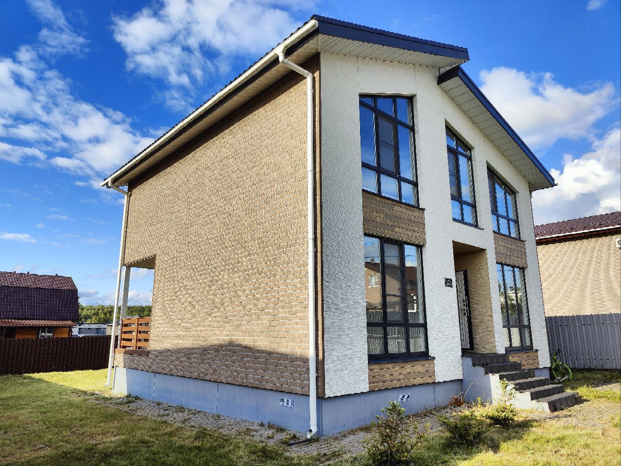 Дом современный, технологичный, надежный, энергоэффективный и теплый с удобной планировкой и панорамными окнами во всех комнатах. Дом построен по финской технологии и европейским стандартам компанией "Dmitry dom". Более подробную информацию о технологии и материалах можно посмотреть у них на сайте.