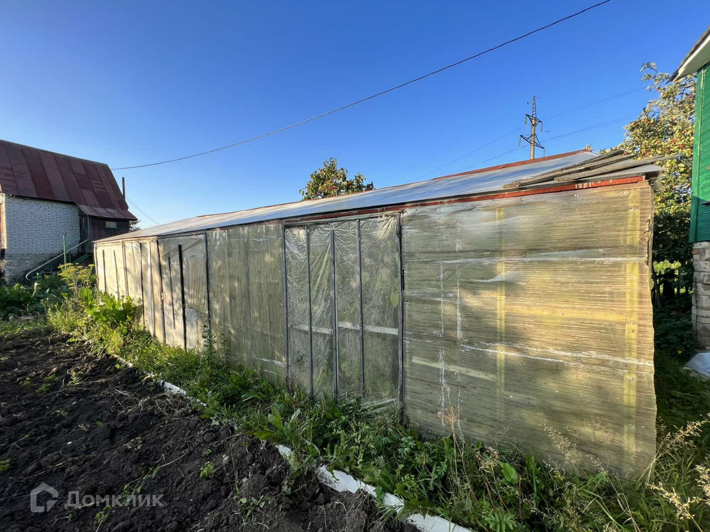 На участке: туалет, большая бочка для воды, теплица.