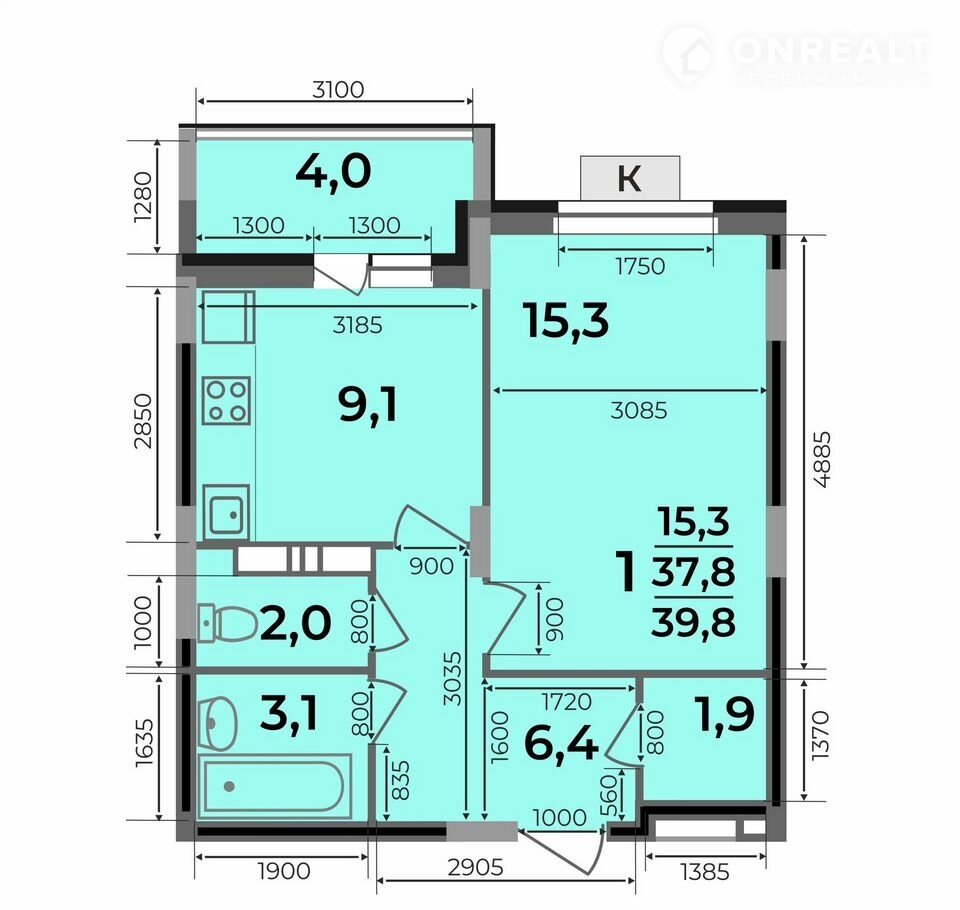 Общая площадь 39.8 м2