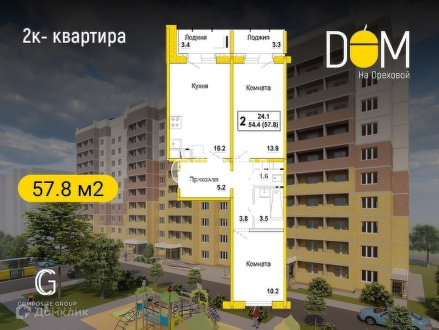Общая площадь 57,8 кв.м. кухня - 16. 2 кв. м, комнаты 13,9 и 10.2 кв.м, с/узел раздельный. Данная планировка квартиры предусматривает наличие двух лоджий!