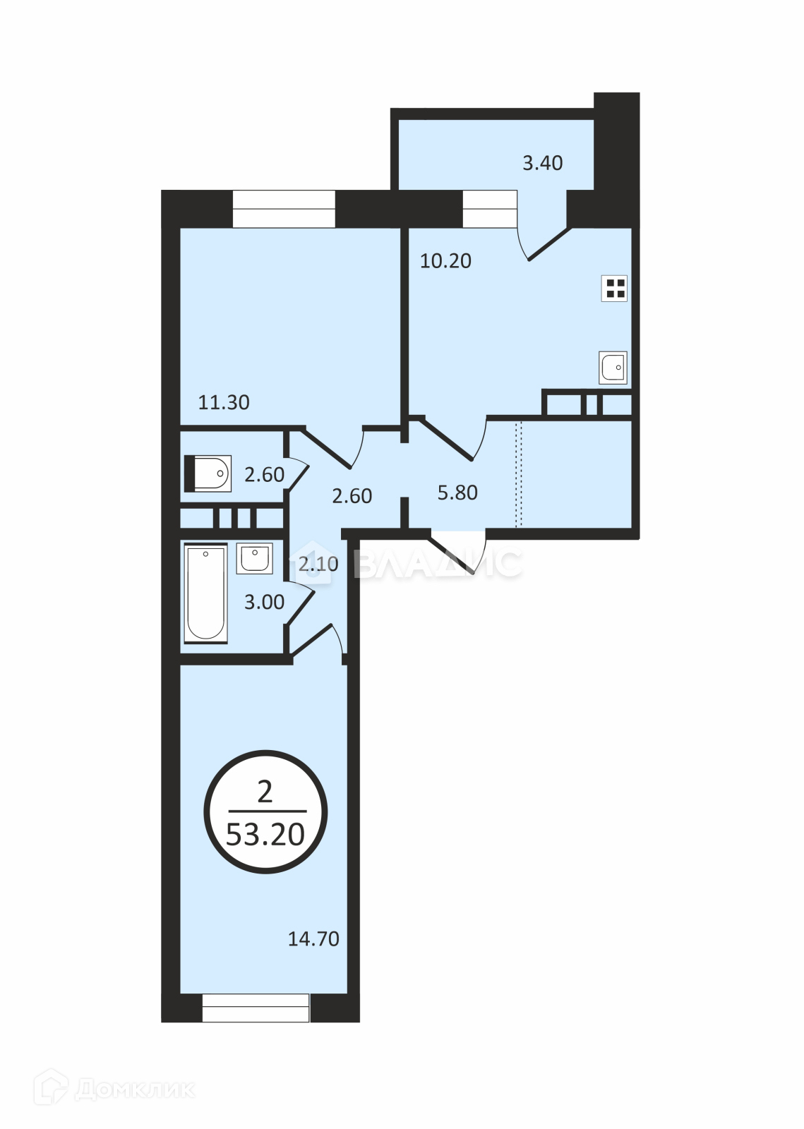 Общая площадь 53.2 м2